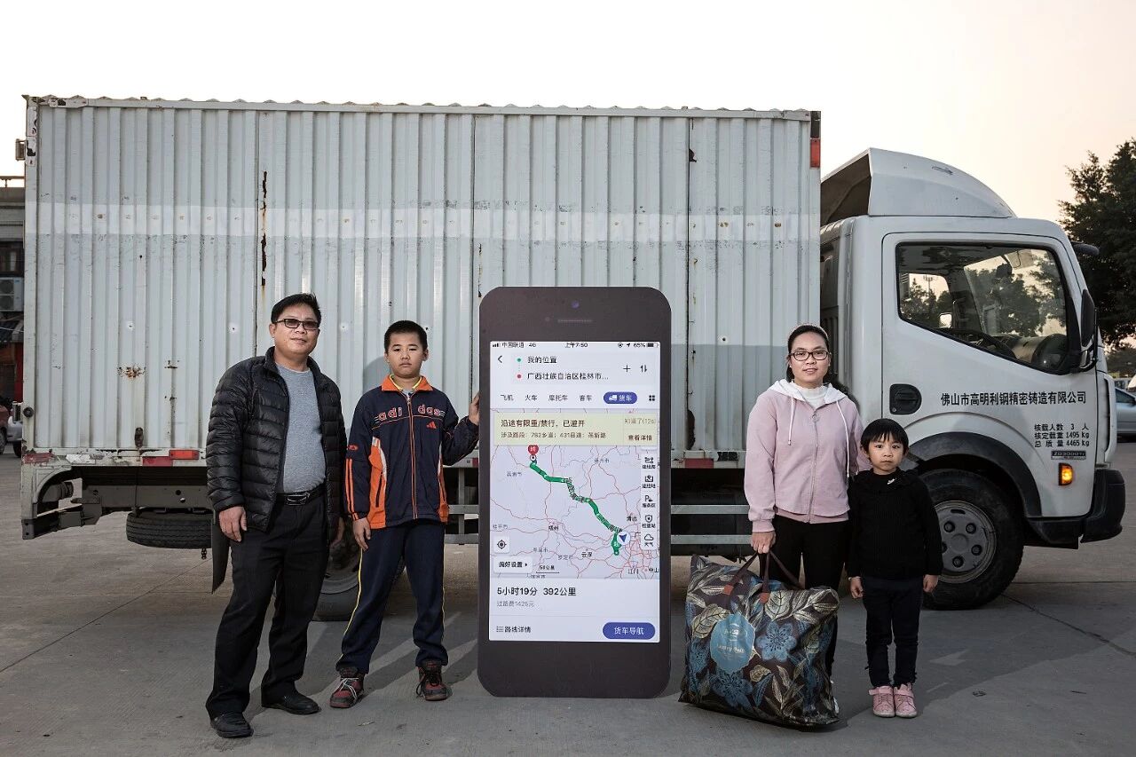 大巴车外,摩托车返乡大军川流不息,车上有父子也有夫妻,行李箱间隙,偶见露出一个毛茸茸的狗头。伍德朝与覃秀梅两夫妇开着摩托,在路上已行驶了4个多小时。因为妻子晕车,每年都是由伍德朝开摩托回家。没跟随大部队,两人单独上路。「衣服扣紧点」,「慢点开」,覃秀梅在后座唠叨,久坐后她常常觉得腿僵疼难耐。伍德朝不说话,盯着导航,一直在地图上寻找下一个驿站。他知道,「吃碗米粉,喝点热茶」,是妻子此刻最想做的事。