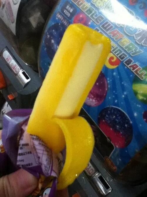 小时候我们都叫它「香蕉皮」,像真的香蕉一样,可以剥皮,黄色香蕉皮是果冻口感的,里面的香蕉果肉就是香蕉牛奶味的雪糕。一块钱一根,放学后买一根,可以同时解对果冻和雪糕的馋瘾。