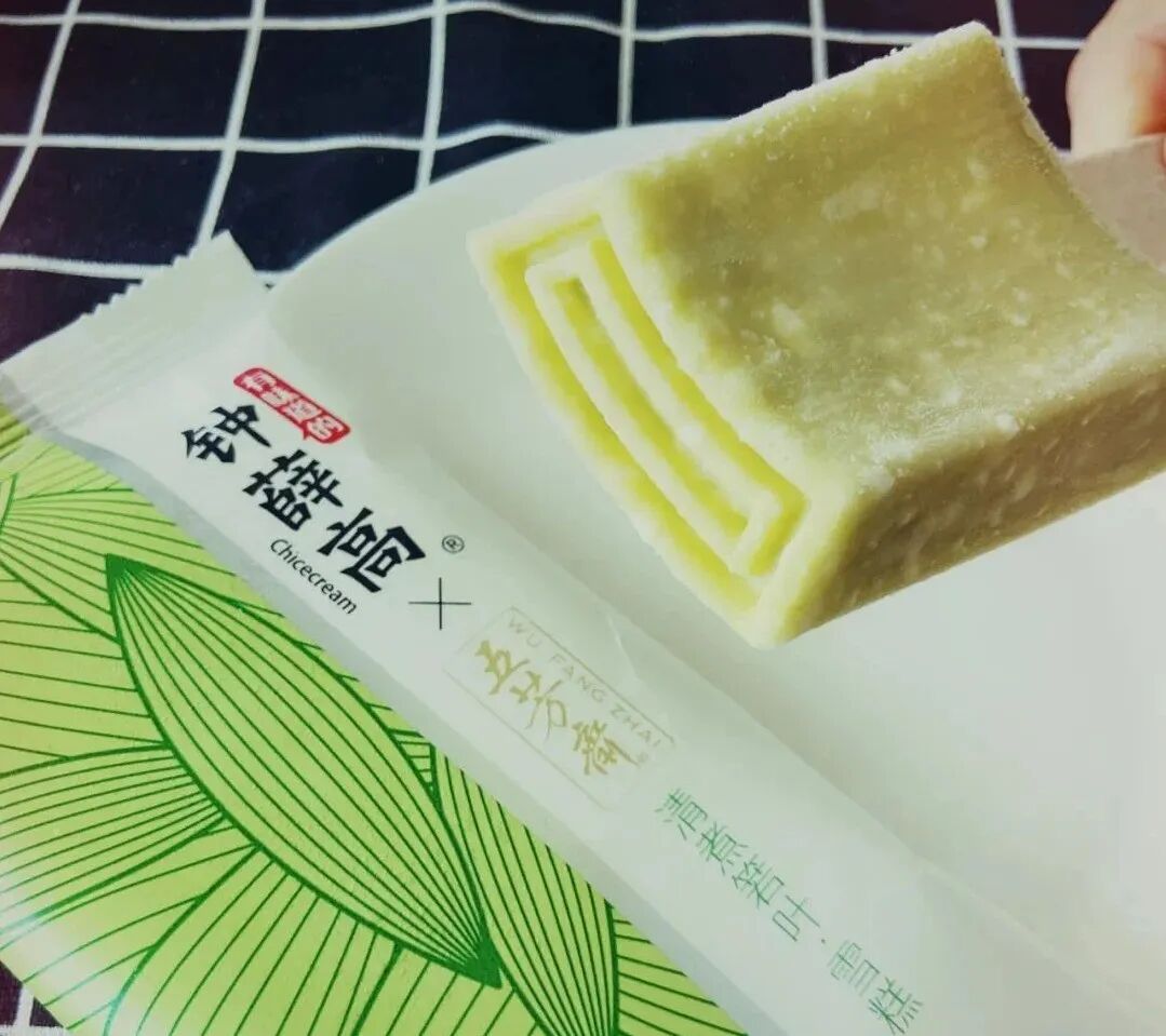 这一款雪糕是钟薛高和五芳斋的合作款,我一开始没抱有期待,但在网上盲买吃后,回家就又下了一单。这一款清煮箬叶·雪糕,有粽叶的绿色和香气,片状的雪糕里,混杂着肉眼可见的糯米,第一口的口感,就非常糯,就好像在吃一点都不甜腻的软糖,又有点像糯米糍粑,和雪糕一块,又有较劲又入口即化,砸砸嘴,还能感受到粽叶的清香和糯米的Q弹,让我觉得今年没吃粽子,也不遗憾了。