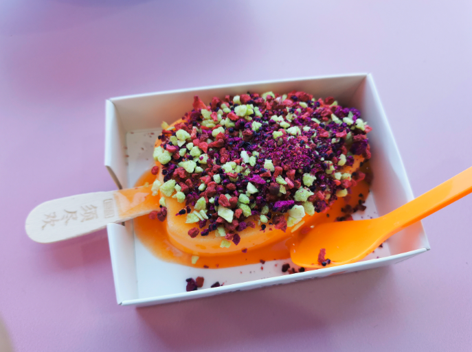 吃过一次现场制作的胡萝卜味冰激凌,是放入模具进一个叫氮气桶形成初步的模样。再让他全身浸满胡萝卜味果酱,再附上两种口味的水果粒,我选择的是猕猴桃和火龙果粒,这三者结合起来就比较的酸甜,开胃。