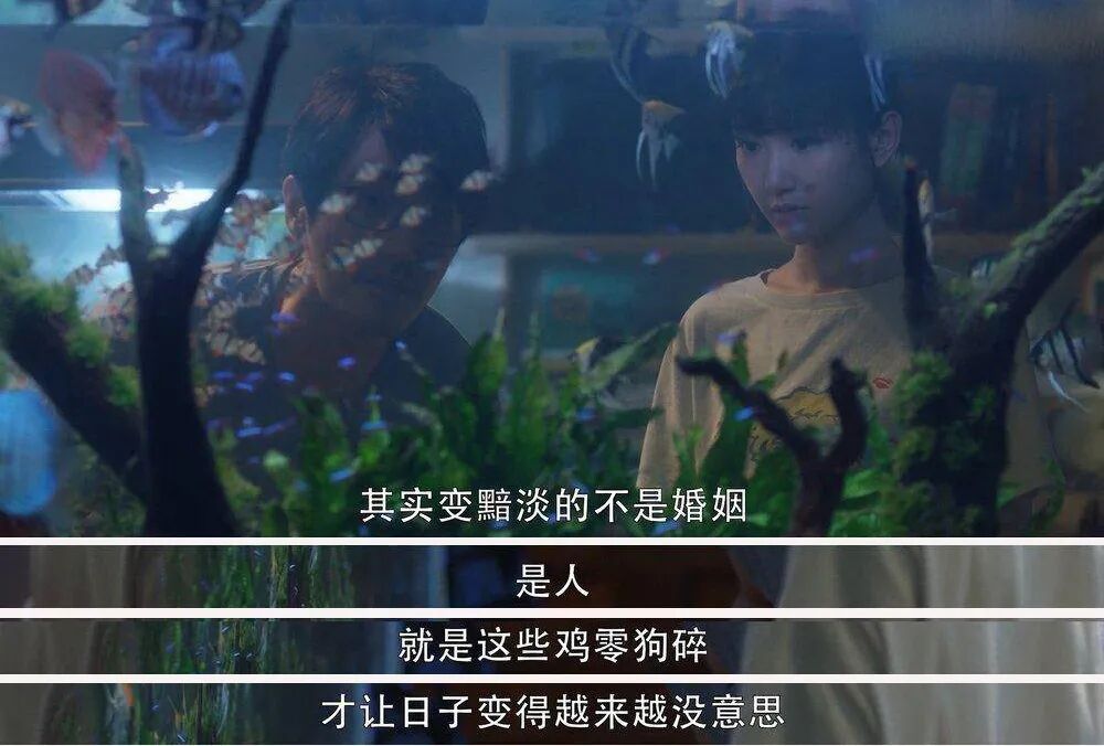 当婚姻出现危机,陈屿新养了一缸虎皮鱼。这种鱼幼年时花纹清晰亮丽,长大后则逐渐黯淡,颜色褪去后,变成一只只驼着背的老鱼——就像他们的婚姻,在鸡零狗碎的日常消磨中逐渐变得黯淡沉闷。