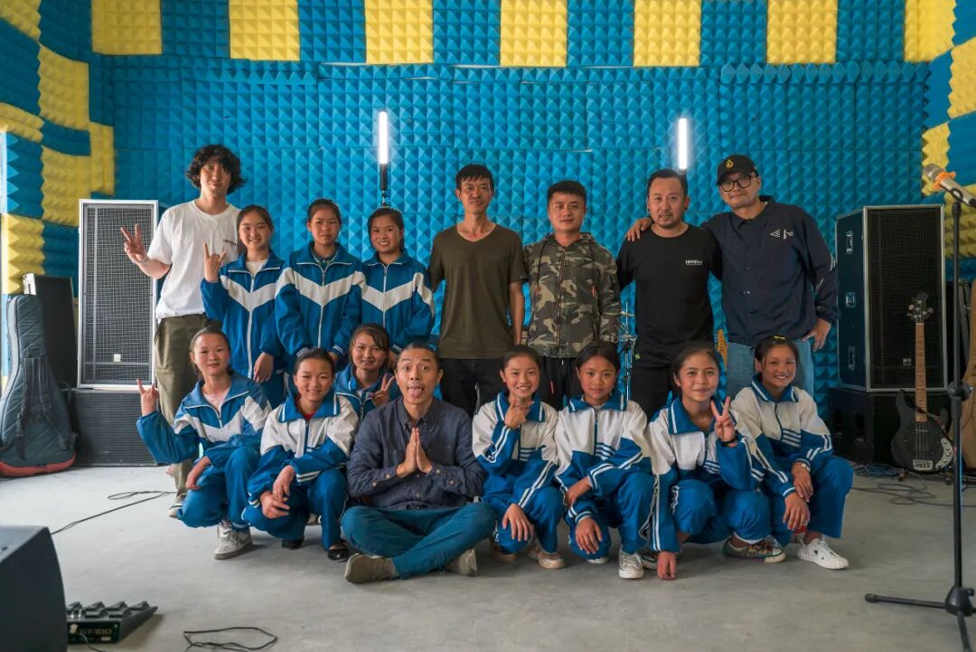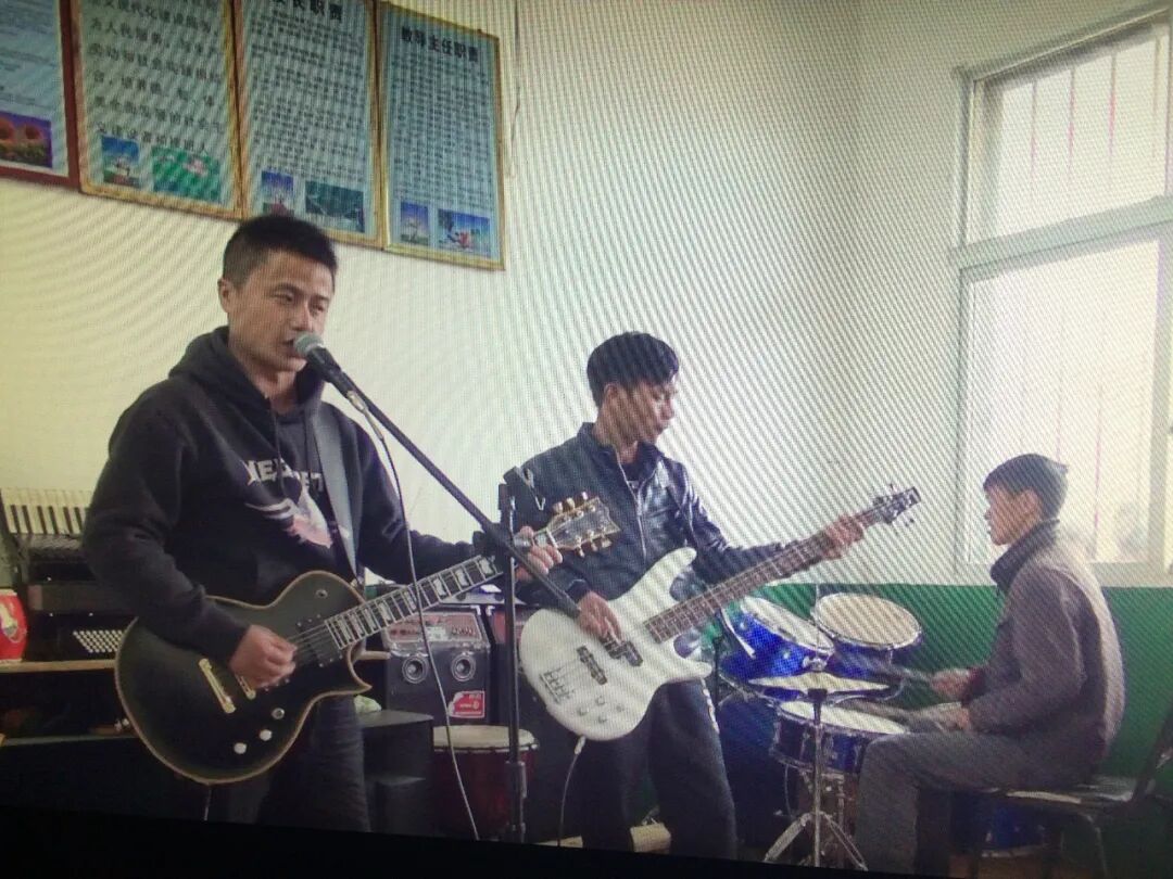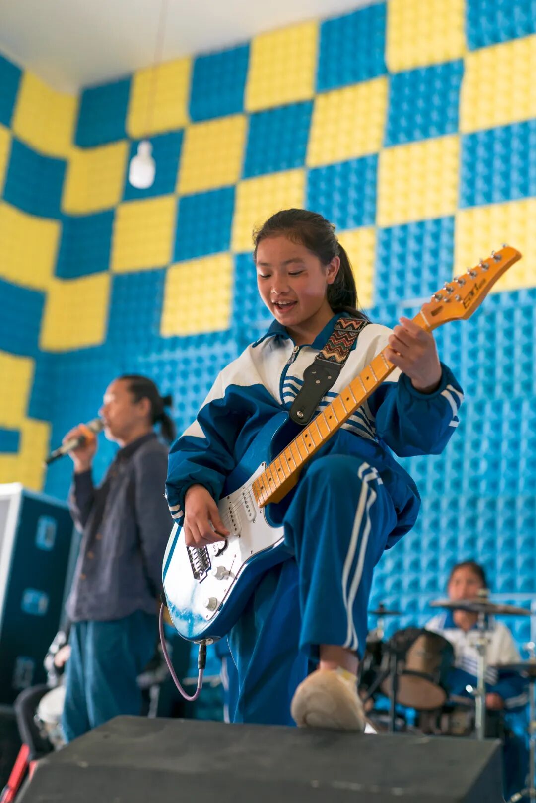 12岁的乐队主唱站在舞台中央,声音清亮,这首《为你唱首歌》已排练过无数次。不同的是,歌的原唱痛仰乐队也站在了这五个穿着校服的乐队成员之中,痛仰乐队的鼓手坐在打架子鼓的女孩边打着手鼓,把主角让给女孩们。46岁穿着牛仔衬衫的主唱高虎跨着马步压低身体,正好与女孩们一样高。这个山村小学里的女孩乐队迎来一支真正的摇滚乐队。