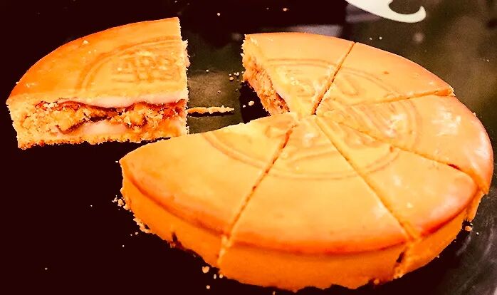 我们家在闽南。十年前,是住在市区的阿姨偶然买回来送给我们的。这个饼不是独立包装的,如同名字「元光大饼」,是需要拿刀子切成块状,再用叉子送进嘴里。月饼外表看起来很朴实,饼身也不厚,却有一身真本事。