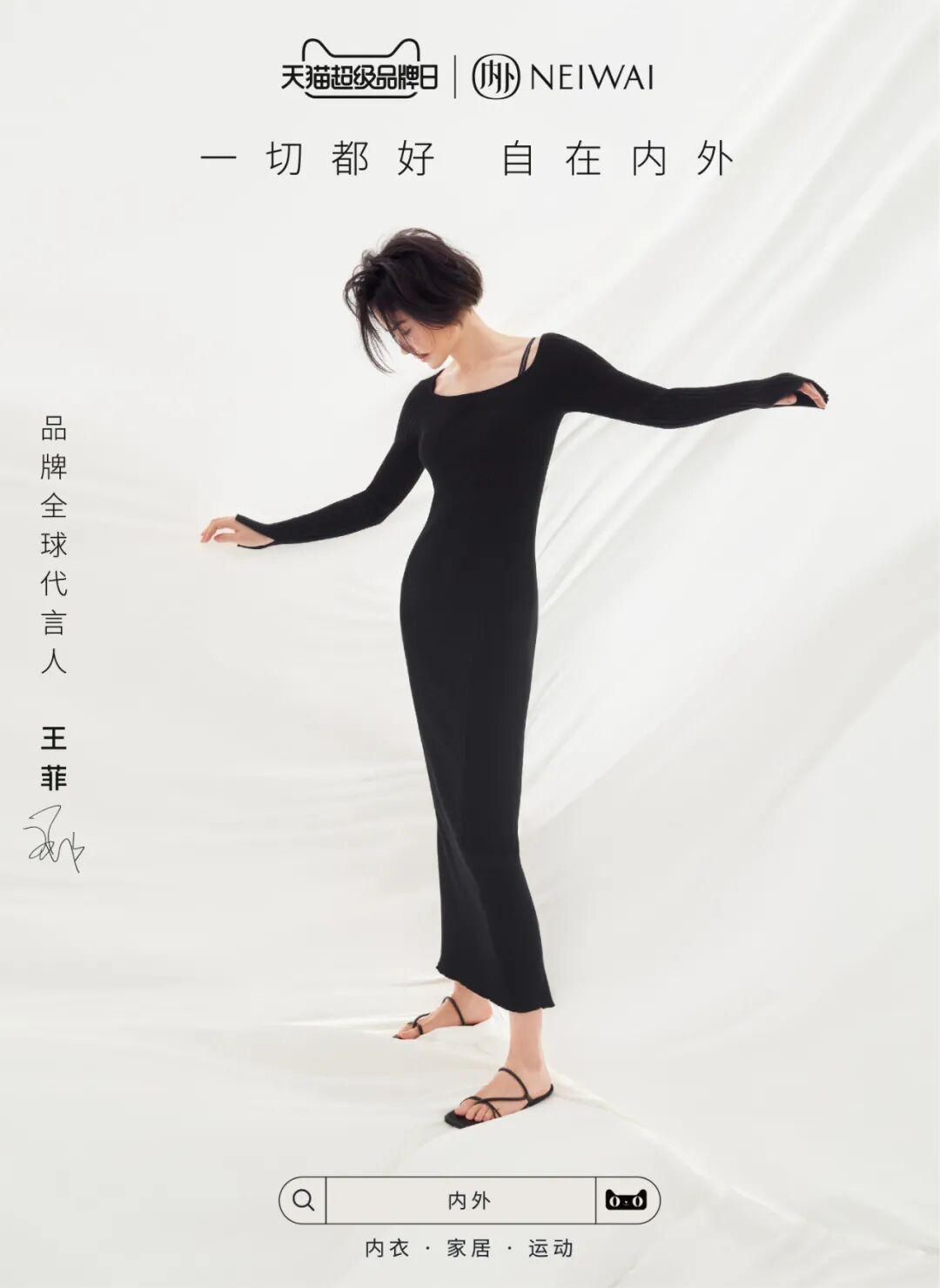 在刚刚结束的天猫超级品牌日,贴身衣物生活方式品牌NEIWAI内外(以下简称「内外」)邀请王菲出演了最新的品牌广告大片。1分钟的视频中,王菲身着内外服饰,优雅游走于多个充满「家」意象的虚实空间之中,念出了多组相互对立又融合的词汇:明暗,虚实,呼吸,动静,冷暖……反正,你我——一切都好,自在内外。