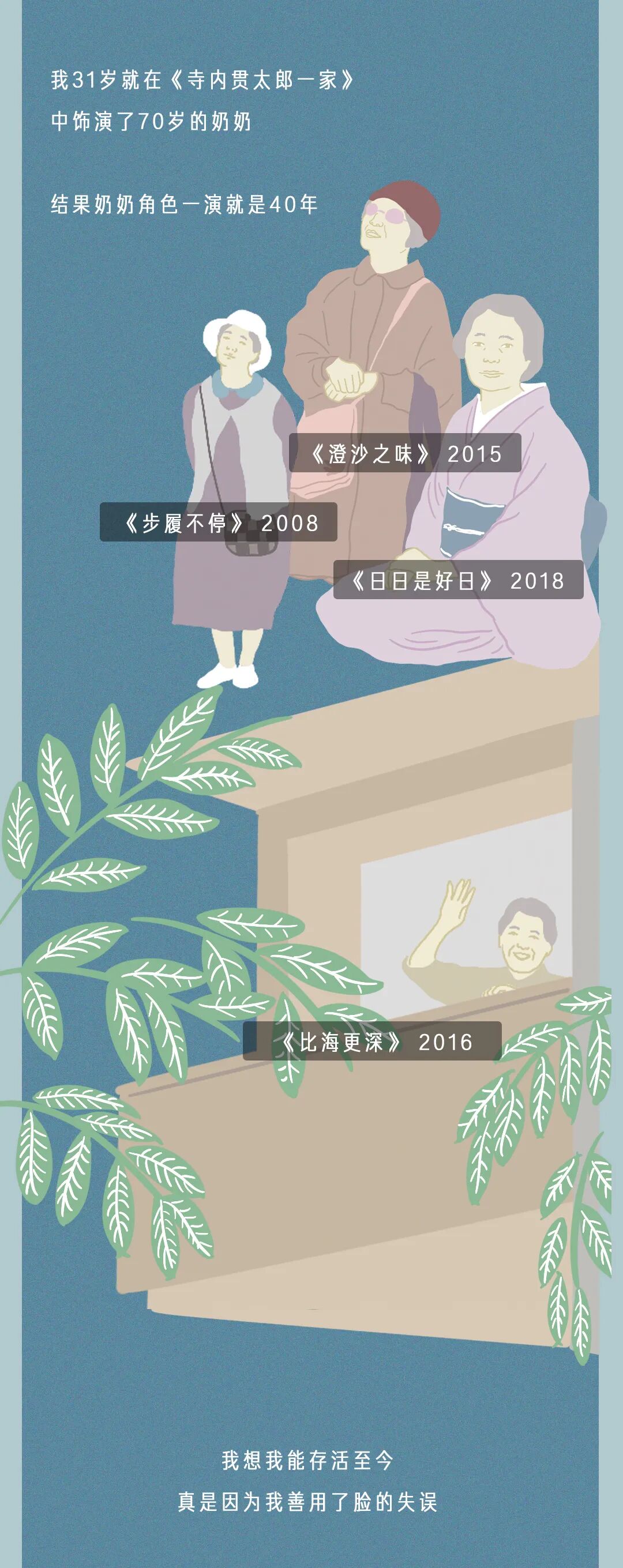 我们多数人是在是枝裕和的电影里遇见了她。她是《比海更深》里「我啊,都这把岁数了,却从来也不曾爱一个人比海更深」的女人,是《步履不停》里「如果没有人可以恨,我会更难过」的丧子母亲,也是《小偷家族》里收容没有血缘关系的流浪者的奶奶。是枝镜头下的她总是刻薄又温柔。