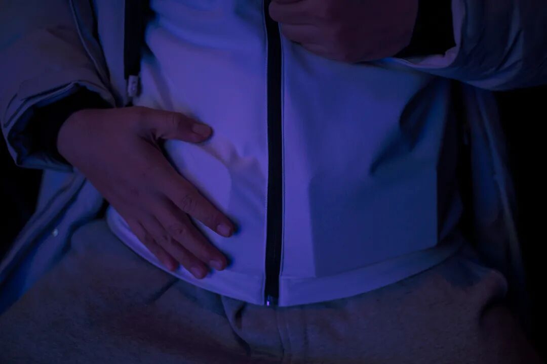 第二天见面时,他略带得意地揭晓了谜底。为了不让观众被体内钻出的线缆和背包吸引注意,他买了许多件马甲,在马甲内侧缝上几个兜,再用自己牛仔裤上剪下的布做固定,控制器和电池就放在这些兜里。这是疫情期间他在家苦心琢磨的成果,「我一直在隐藏它,尽自己最大的努力把它隐藏着,买大一点的衣服把它包住,或者制作马甲,尽量不让它露出来。」