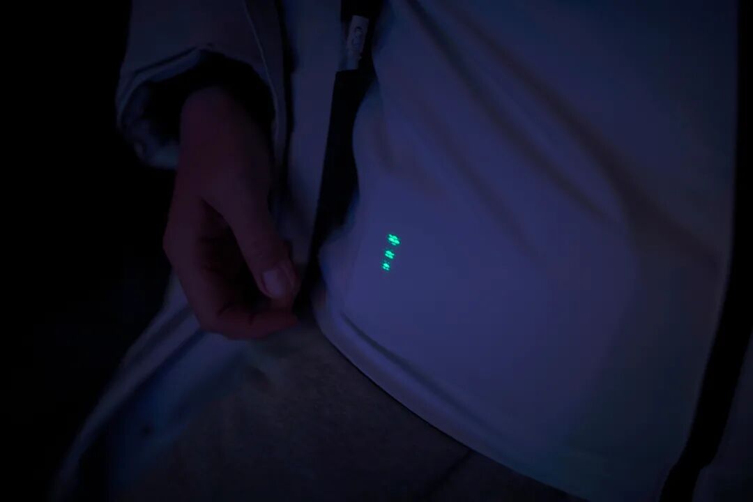 王洋洋马甲兜里的控制器电量显示。尹夕远 摄