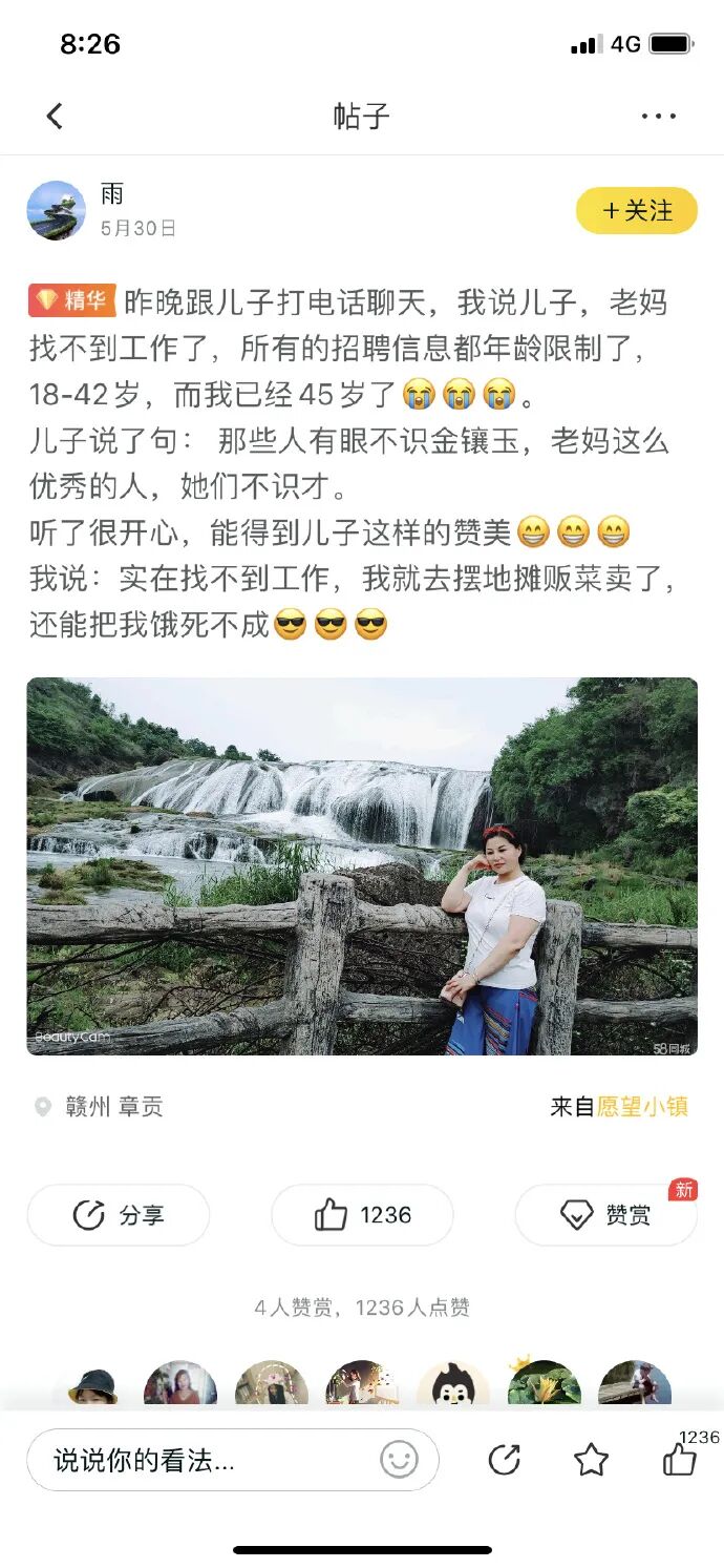 最打动我的,是一位母亲的独白。这位母亲记录下了自己和儿子的对话。「儿子,老妈找不到工作了,所有的招聘信息都年龄限制了,18-42岁,而我已经45岁了。」电话那头的儿子说,「那些人有眼不识金镶玉,老妈这么优秀的人,他们不识才。」这位求职不顺的母亲,写下的文字却是快乐的,因为「能得到儿子这样的赞美」。她配上一张笑靥如花的照片,戴着红色的发卡,像一个少女。