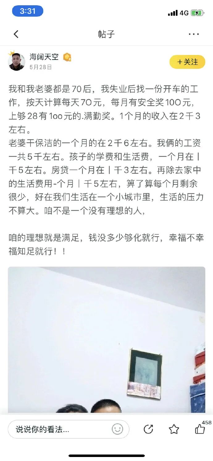 一个叫木木的女孩,在失业的第7天,成功地面试上一份工作,离家只有900米,找到工作的那个下午,她去湖边坐了会儿,「一眼望不到边,湖面层层涟漪,柔静而平和」。一个广西的网约车司机,会因为一天接了两个机场的单子,而兴奋地发帖感叹「运气来了挡都挡不住」。生活太苦了,一点点简单的快乐都足以温暖人心。