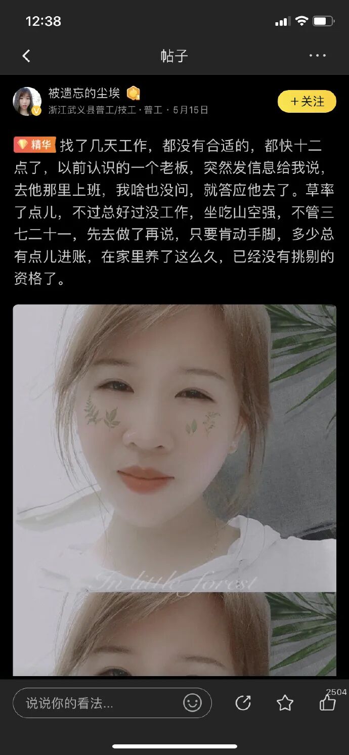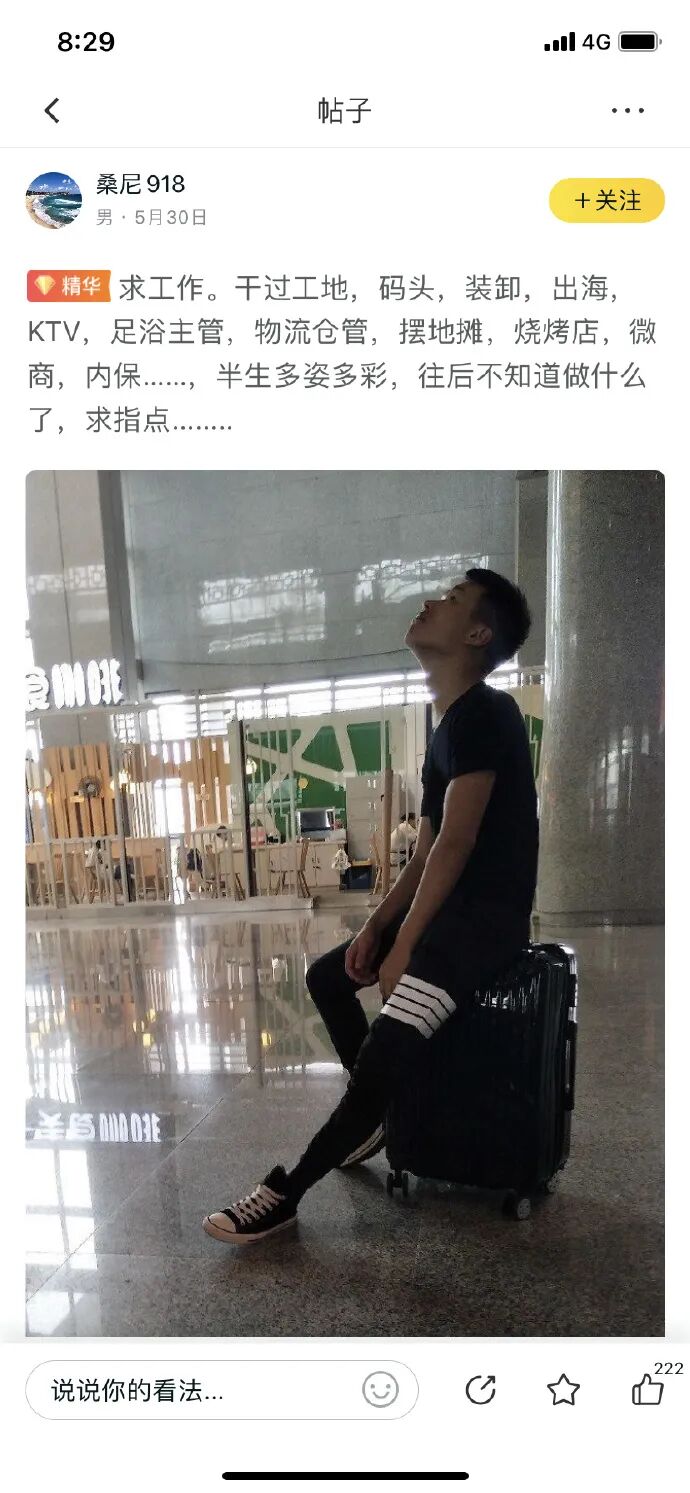 一个「干过工地,码头,装卸,出海,ktv,足浴主管,物流仓管,摆地摊,烧烤店,微商,内保……半生多姿多彩,往后不知道做什么了」的小伙子,看上去有些迷茫,发了帖子「求工作,求指点」。