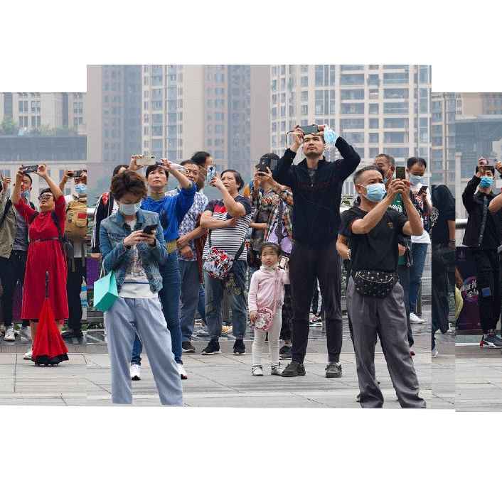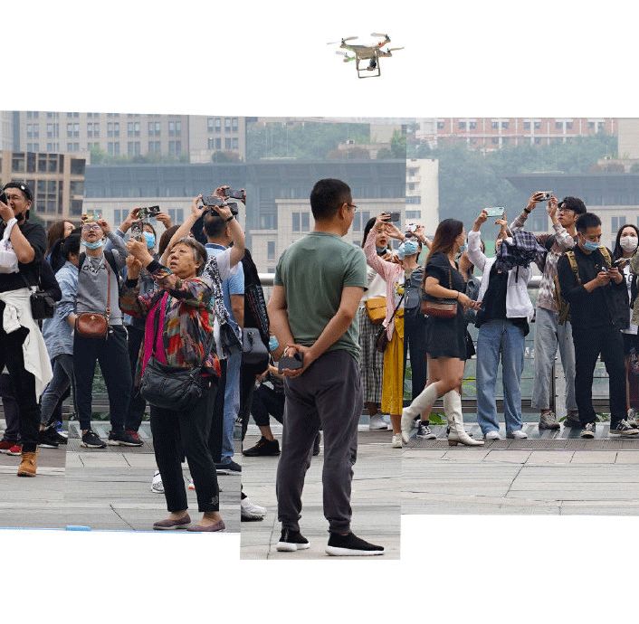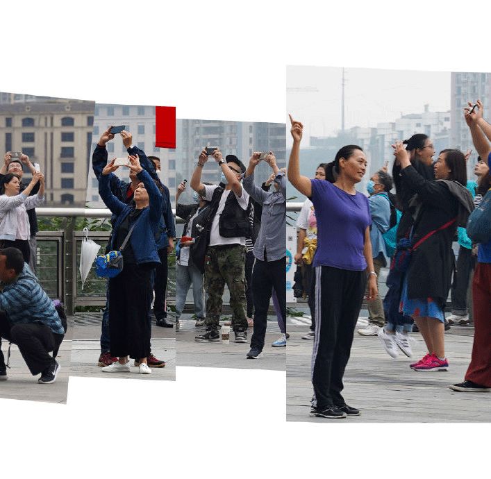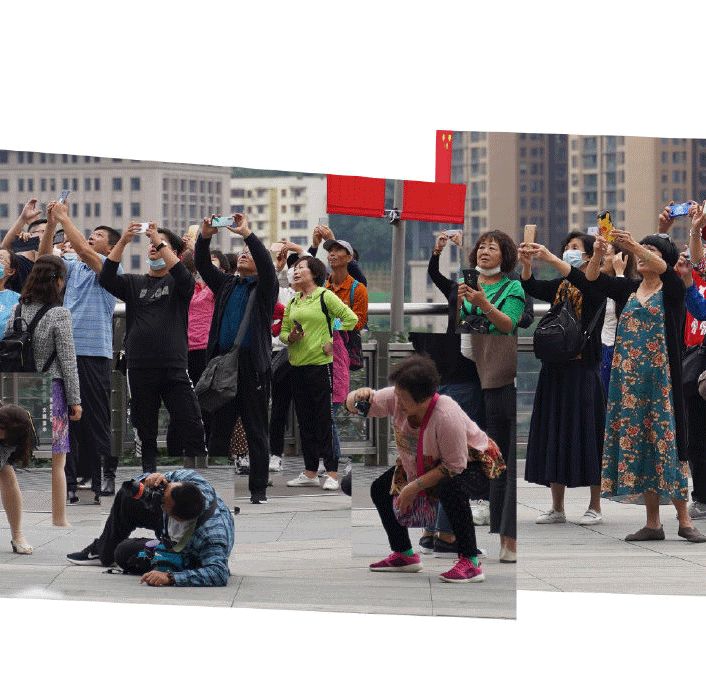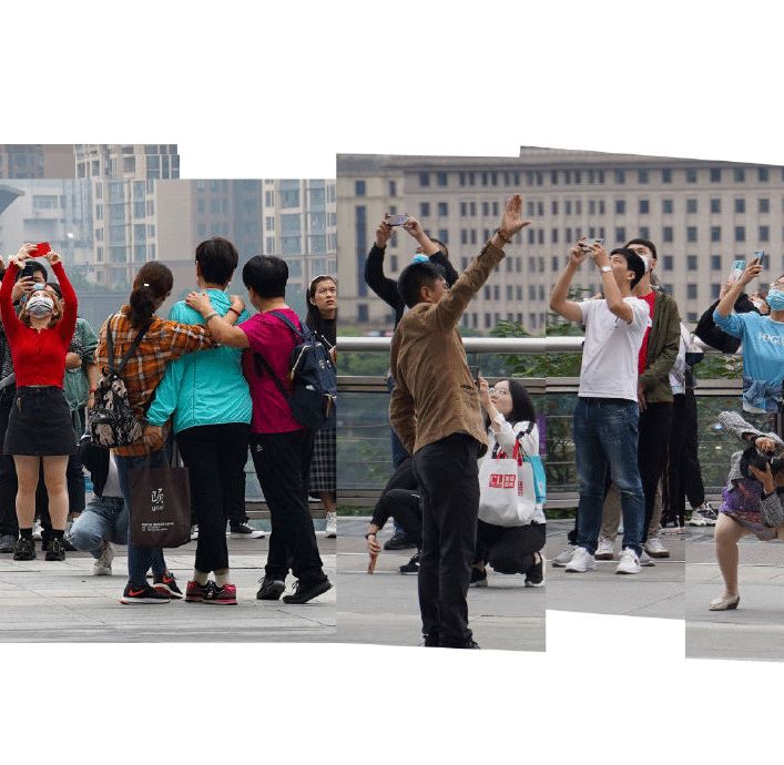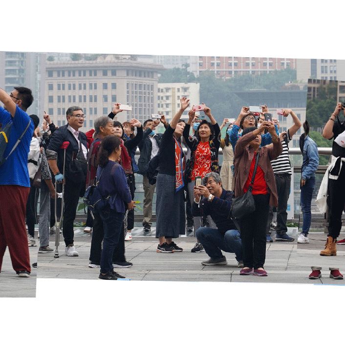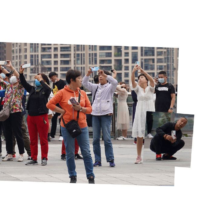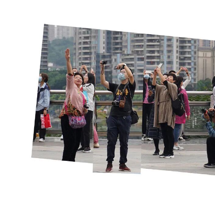 我将这些照片拼成长图,呈现一幅群像——是无数正在拍照的人,取名「每个人都是摄影师」。有读者似乎从这幅群像中看到了某种荒诞,他在留言区留言,「重庆李子坝地铁站,每次坐地铁路过都跟看猴一样」。但其实这些为了图像而「疯狂」的人,自身也成了一种景观。