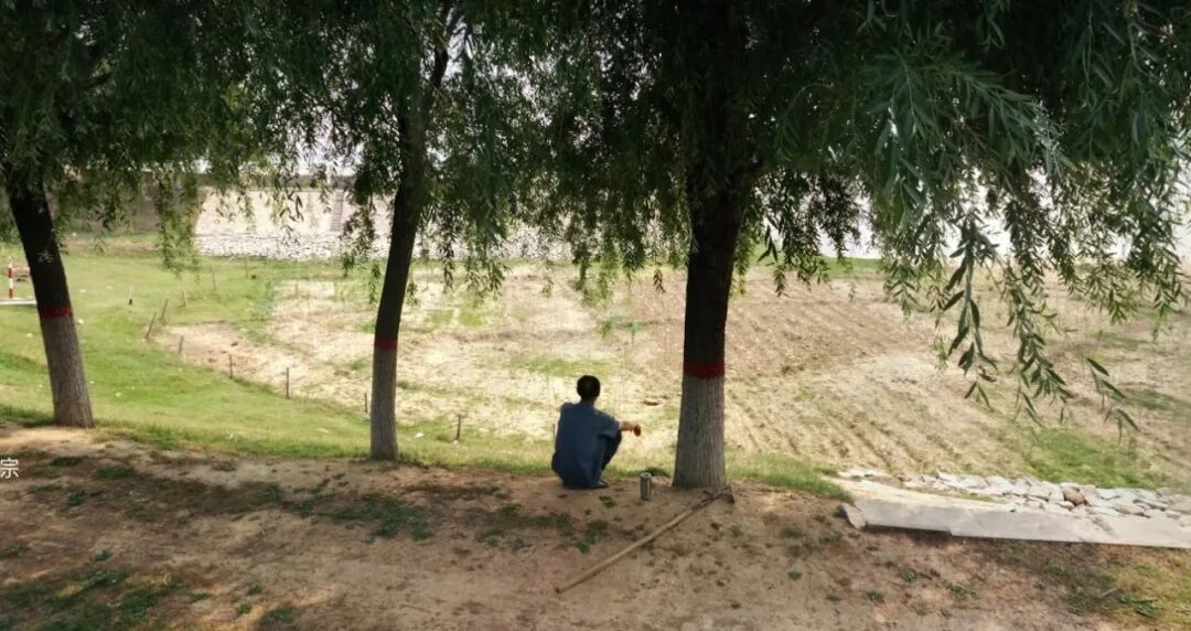然后,我又点开了江南的一个圆点,看到一个在田间地头休息的老汉,他坐在一棵柳树的阴翳下,对着眼前还没有平整完毕的泥土,身边是一个耙子,一个水杯。