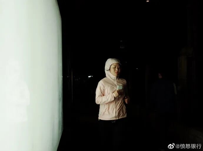 2018年前后,他开始用「愤怒银行」的ID在微博上分享他的观察成果——他用相机拍下了很多普通人的普通瞬间——路过广告灯箱的人、等红灯的人、车站前开摩的的人、在夜里出没的人、坐在栏杆上看别人跳广场舞的人、在网络直播服装批发市场送货的人……