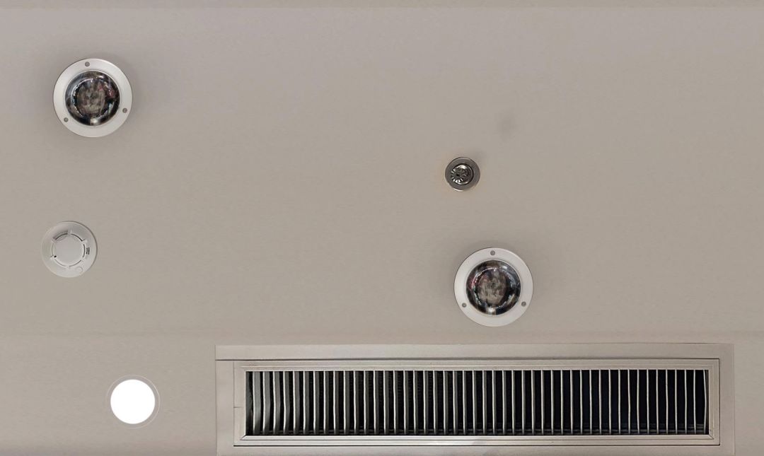 当时,我不好直接地拍摄房顶的摄像头,于是,我记下了房顶的元素,有烟雾报警器,排风口,摄像头,以及它们的位置排布。后来,我按照记忆的位置,收集素材拼贴出了一组还原当时屋顶的长图——无尽的房顶,无尽的摄像头。我为这张图取名为:「海底捞的房顶」。