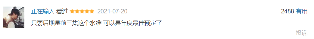 豆瓣网友@正在输入 在这部剧播出第二天就打出了5星,并在短评区里写道“只要后期是前三集这个水准,可以是年度最佳预定了”。这条留言获得了2488个“有用”。