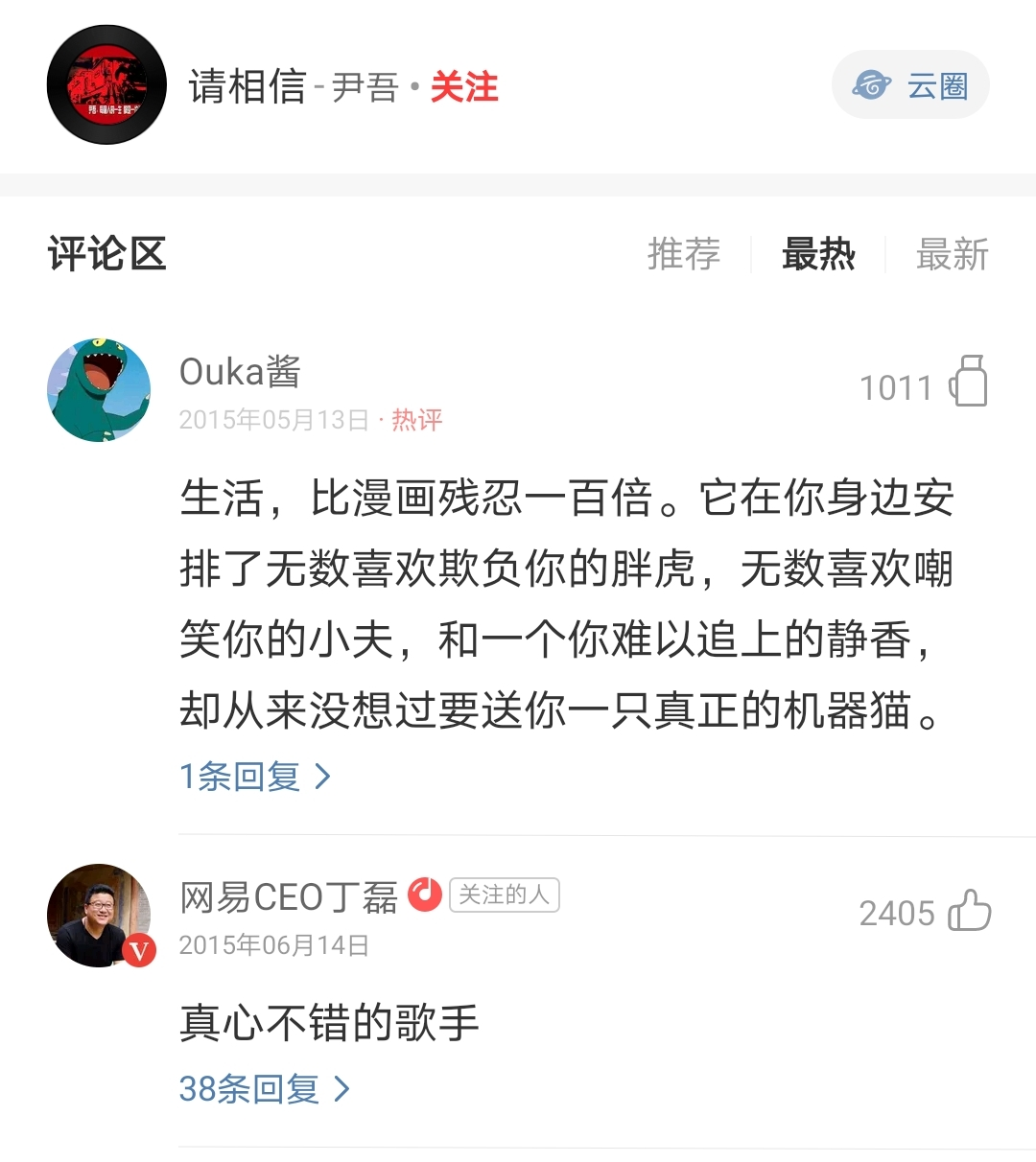 以尹吾为例,他曾经是北京民谣圈的风云人物,和朴树、叶蓓并称“麦田三原色”,后来音乐行业下行,无奈放弃音乐,离京回乡。十九年后,一次偶然的机会,他在网易云音乐活了。因为丁磊给他的歌曲《请相信》写的一条评论“真心不错的歌手”被置顶,网站也因此给了推荐位。在网易云音乐的推荐下,这位老音乐人重新获得更多关注,2019年再次发布新专辑。