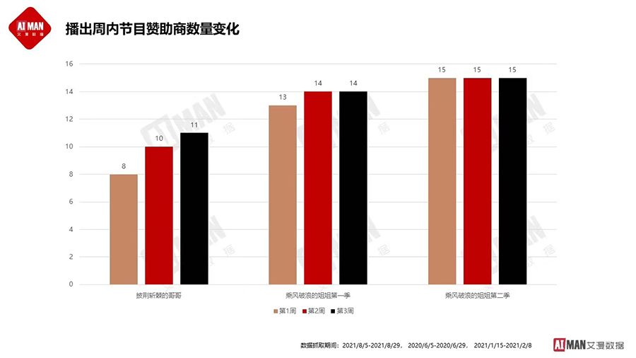 据统计,8月12日,节目首播时共有8个赞助商,到了播出第二周和第三周时,这个数字变成了10个和11个。