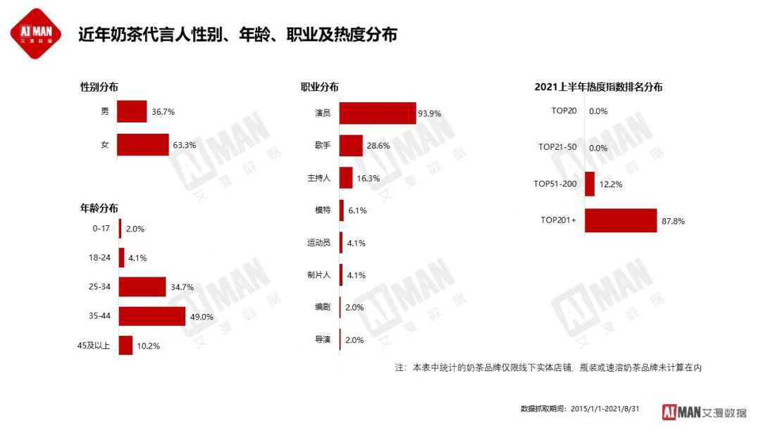 根据艾漫数据统计,自2015年至2021年,担任奶茶品牌代言人的明星中,93.9%有演员的职业身份,59.2%的代言人的年龄分布在35岁及以上。