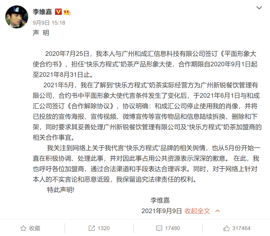 9月9日,因负面舆论持续发酵,李维嘉方面迅速发布声明,声称已于2021年6月1日与广州和成汇信息科技有限公司解约,不再担任产品形象大使。解约原因是今年5月发现“快乐方程式”奶茶的实际经营方为广州新锐餐饮管理有限公司,而非和成汇公司。