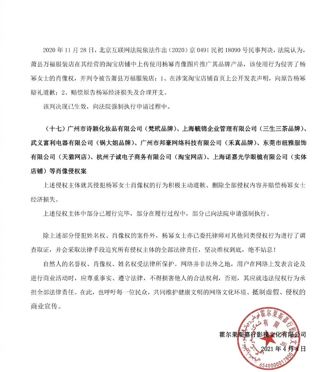 杨幂工作室就曾在微博上发布2019年至今的维权结果,其中侵犯杨幂姓名权、肖像权的案件数量达到17起,而这还只是部分案件。有媒体报道,据不完全统计,杨幂在过去几年遭到三十多个商家侵权,其中最高的赔偿金额为25万元,最低的是5000元。
