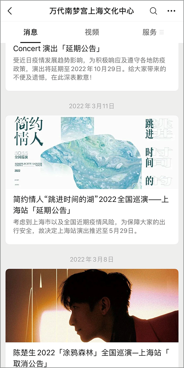其他如ModernSkyLAB、育音堂音乐公园、MAOLIVEHOUSE上海等等官方公众号近期的推文,也几乎都是延期和取消演出的消息。