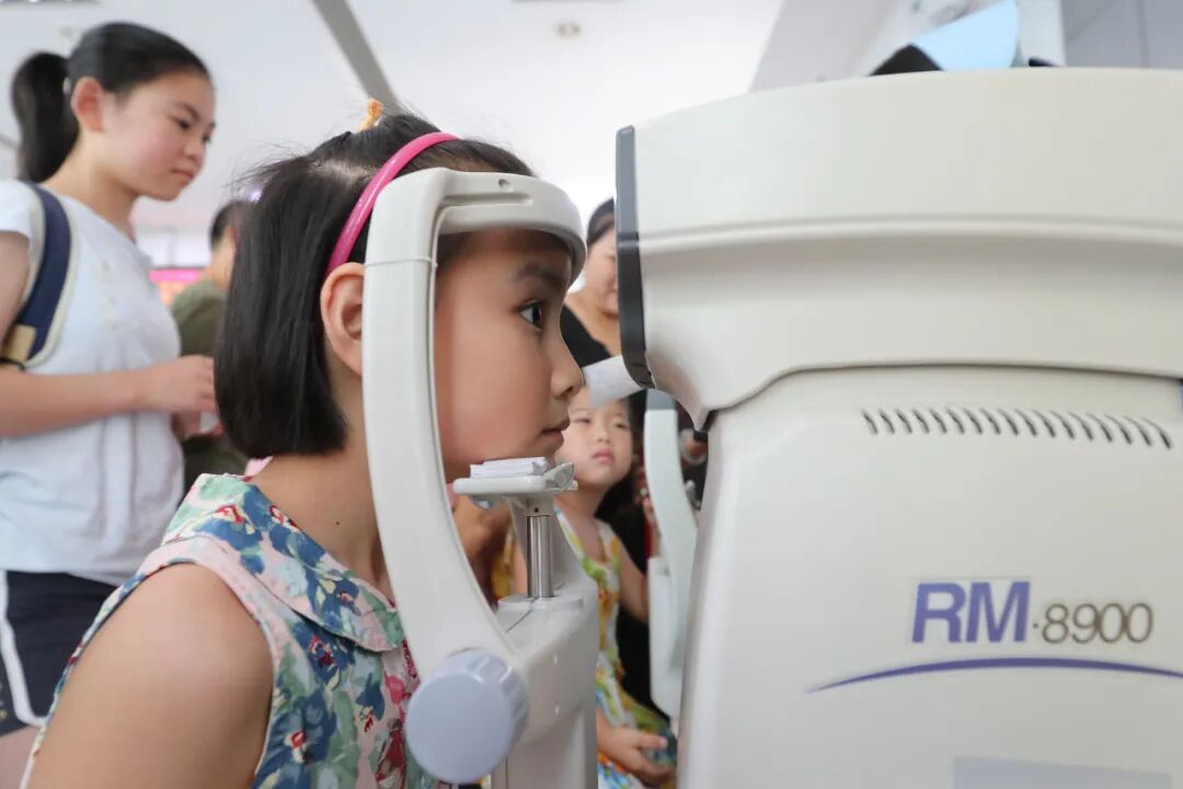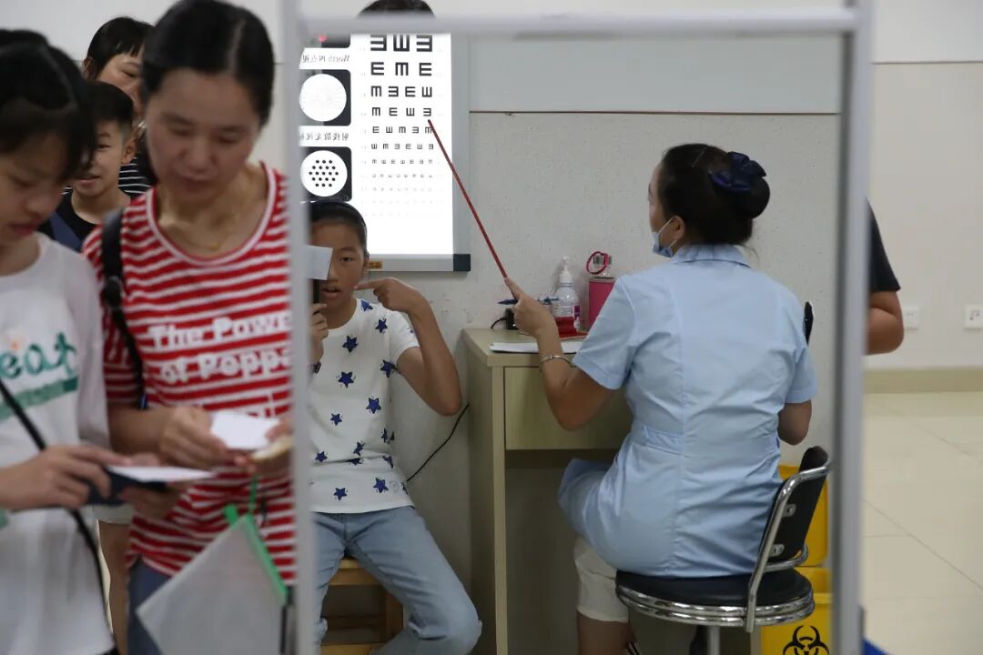 开学前夕,测视力、验光的中小学生和家长排起了长队