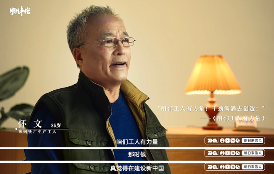 85岁的前钢铁厂生产工人怀文的思绪回到了1953年的春天,他和工友在钢铁厂挥汗如雨的唱着《咱们工人有力量》。