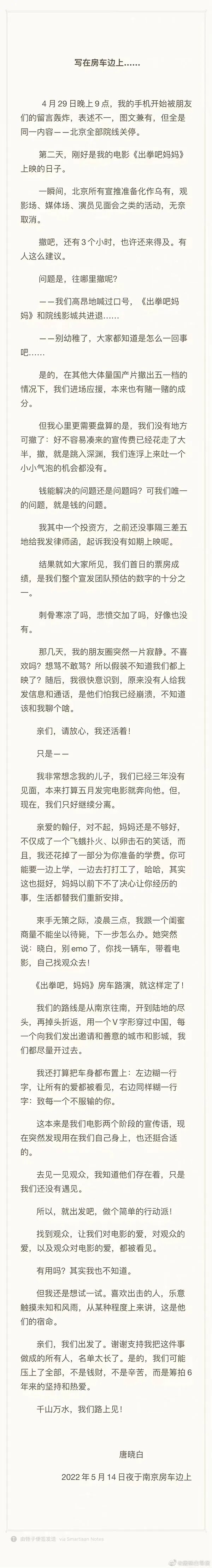 5月14日晚,在房车边上,唐晓白写下了一路上的心路历程。这是一次“说走就走”的路途,也是一个电影人面对环境的不确定时做出的自救,于胸腔中发出的一声呐喊。他们在房车的两边贴上了标语——“让所有的爱都被看见,致每一个不服输的你”。