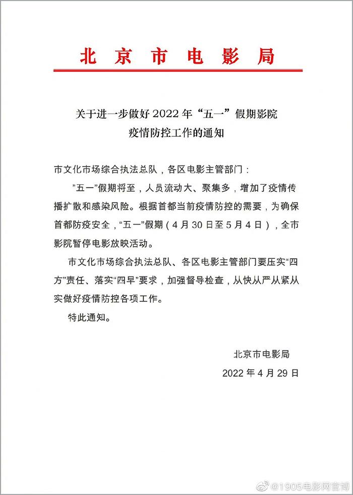 4月29日,北京市电影局发布《关于进一步做好2022年“五一”假期影院疫情防控工作的通知》
