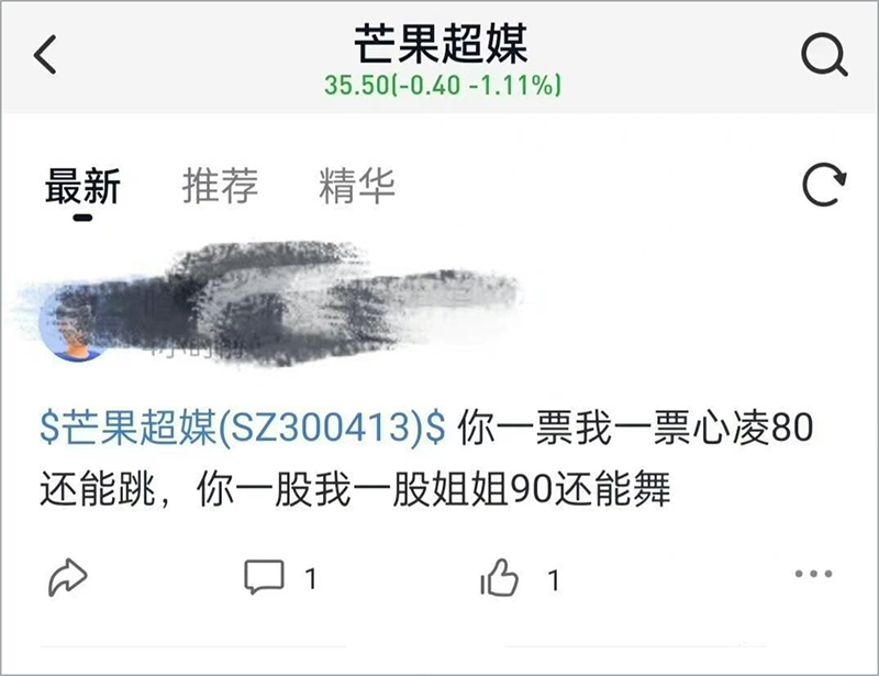 短视频平台外,打趣着自己“初见斜刘海,现在地中海”的“王心凌男孩”们,也无处不在。在芒果超媒股票线上交流的板块里,出现了“你一票我一票,心凌80还能跳,你一股我一股,姐姐90还能舞”“王心凌男孩速速归位”等留言。