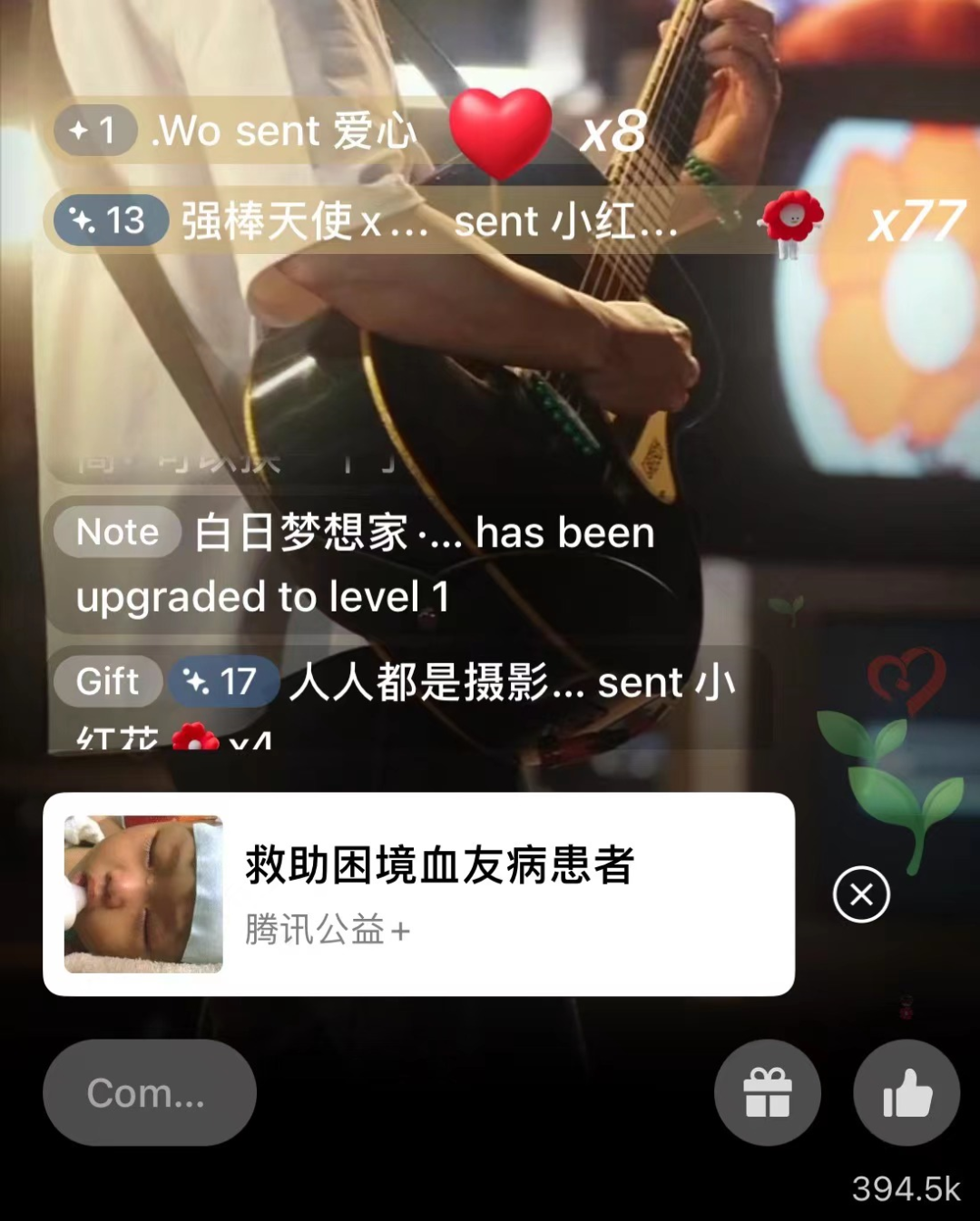 为了更好地举办这场线上音乐会,腾讯公益和微信视频号相关团队进行了大量的沟通,做了一个共建开发,定制了“小红花公益音乐会”专属的打赏礼物,比如爱心小红花、小红花人等,内测时就引发了不错的反响。