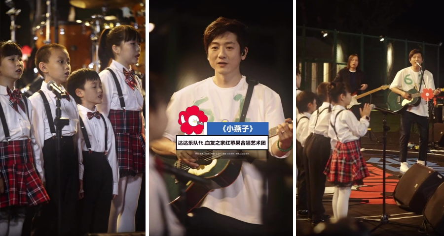 达达乐队唱起了《小燕子》,海龟先生唱起了《蓝精灵》,旅行团乐队则唱起了《鲁冰花》。这些耳熟能详的童年音乐,用一种摇滚的方式呈现出了特别的气质。而他们身边,则是来自各地公益机构的孩子们,用清脆的童声一起演唱。