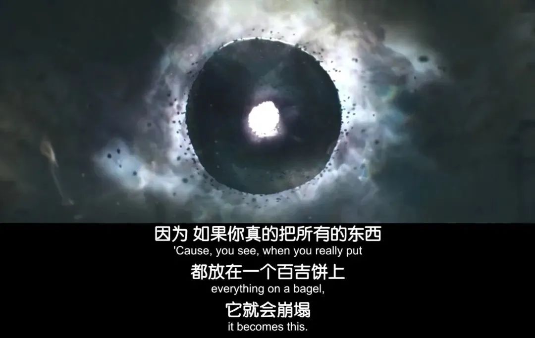 很多人都能在伊芙琳身上看到自己妈妈的影子,她事无巨细地操持着家庭与洗衣店的运转,对每个家庭成员的生活发表自己的意见,但想让她停下来听自己说几句话几乎是不可能的。缺乏沟通和理解的家庭生活塞满了一地鸡毛,大家都疲惫不堪。漩涡中心的妈妈觉得自己为家庭已经精疲力尽、委屈不已,但家人感受到的只有被冷落和无视的苦闷。丈夫拿着离婚申请表试图挽救婚姻,「离婚」两字根本开不了口,报税、煮面条、补天花板的事情塞满了伊芙琳的脑袋。乔伊追着妈妈在楼梯上一路小跑,想跟她谈谈自己女朋友的事情,但妈妈无暇回应,「你知不知道,你老妈对你交女朋友的态度已经很开放了,她还是一个老外。」伊芙琳也曾抱着无限期望来到美国,希望建立一个美满的家庭。但现在,她顾不上理解丈夫、女儿,也顾不上理解她自己。如果不是「发了疯」,这样的日子没准会再持续二十年。即使在报税局的电梯里,平时扶不上墙的丈夫突然「魂穿」成特工,向她展示了伊芙琳的一生,她也只骂了一句「神经病」,然后就推着轮椅上的老爹继续去面见报税官了。最终让她投身这场疯狂游戏的开关,是得知世界的毁灭与女儿息息相关。「特工丈夫」来自于平行宇宙Alpha,在那个时空里,Alpha伊芙琳成长为一位杰出的科学家,发现了与其他宇宙的自己意识连结的方法。她不断鞭策自己的女儿Alpha乔伊在宇宙穿梭中突破自己的极限。即使故事没有展现,我们也不难想象一个孩子在天才母亲的极限训练中,所积累的疲惫、愤怒、怨恨、自我厌弃。当她终于能够同时存在于每一个平行世界、拥有无穷知识与无上力量后,荒谬和空虚占据了她的心。一切客观真理、道德或法律都失去意义,Alpha乔伊成为了邪恶的「丘布·图巴姬」。她创造出一块黑色的贝果,将所有的佐料堆在上面之后,那始终无法被填补的空心变成了一个吞噬一切的黑洞。