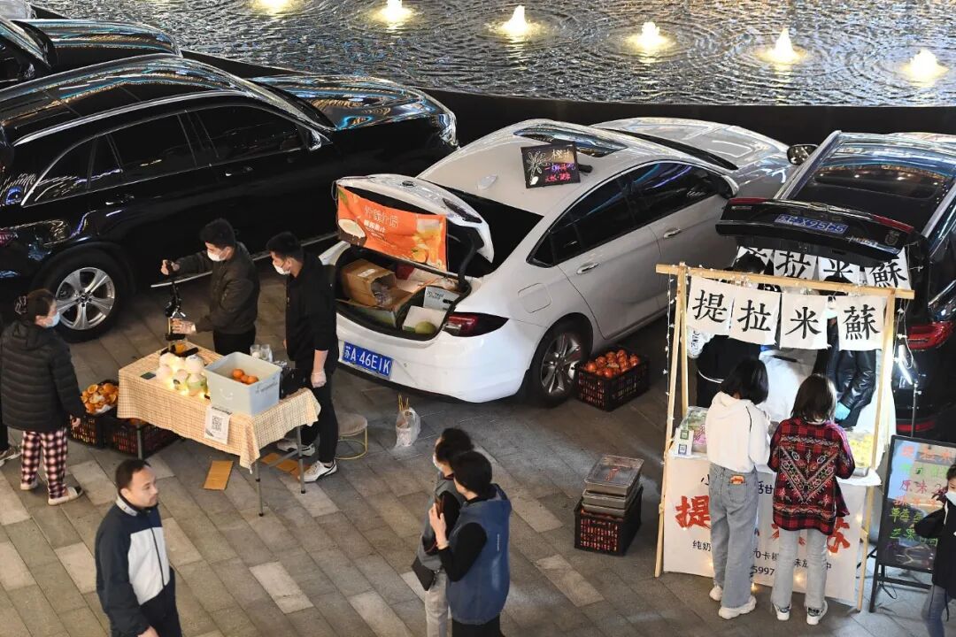 在这些车里,不到两平方米的后备箱被塞得满满当当,空气中弥漫着各种味道,音乐声夹杂着吆喝声,有人卖饮品,有人卖烧烤,还有人卖服装饰品。