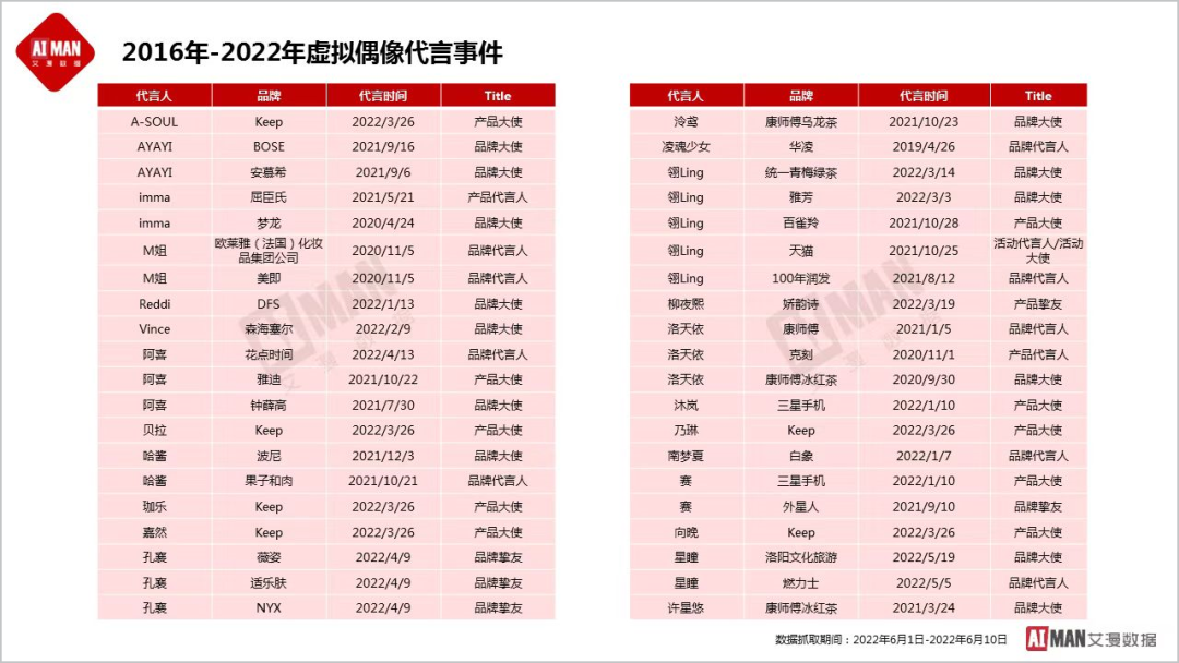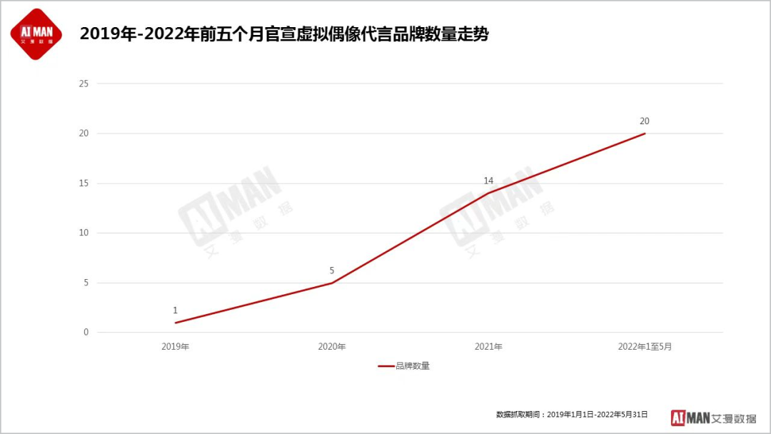 这两年,数字人担任品牌代言数量增多,根据艾漫数据不完全统计,2022年1月至5月,有20起官宣数字人为品牌代言人的代言事件发生。这个数量远远高于往年。