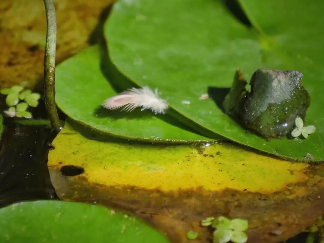 城市中能发现不少鸟类的痕迹,这是一个小池塘边上,一只棕背伯劳留下的羽毛图源泖汊