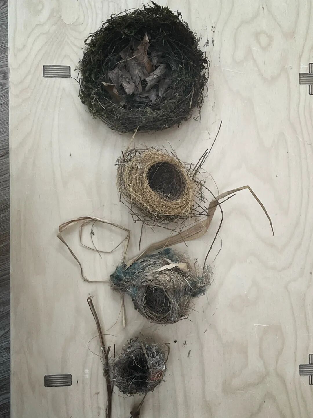 第一只鸟窝是浅棕色的,是山鹪莺用苇草编织而成,常见于村庄和田野。第二只鸟窝有点黑,混杂着大量的泥土,它来自较为幽深的森林。建造这只鸟窝的紫啸鸫很有闲情雅致,甚至在上面点缀了苔藓和枯叶。其余两只白头鹎鸟窝是最特别的,它们被捡拾于城市地带,树枝里缠绕着蓝色、绿色的玻璃丝和塑料制品,颜色非常鲜艳。