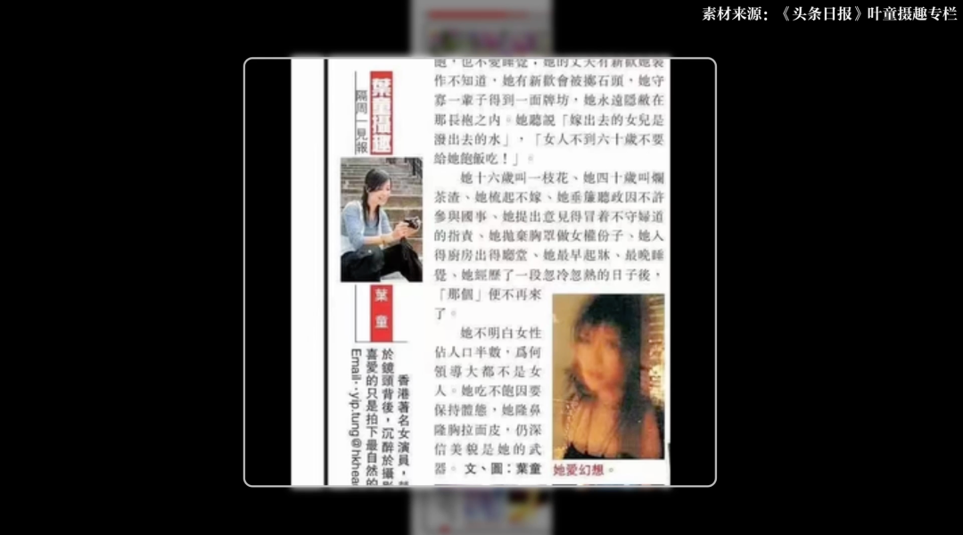 《人物》:我之前看到过,就是一份报纸的栏目好像是叫「叶童摄趣」,就是会有你拍的照片,然后你也会写对女性的各种定义和称呼是不公平的,我还挺想知道,你的女性意识从哪里来的?