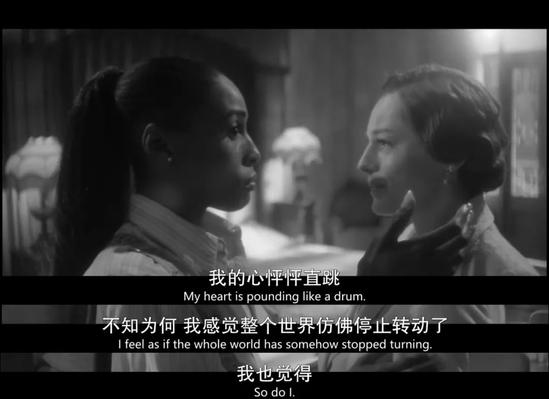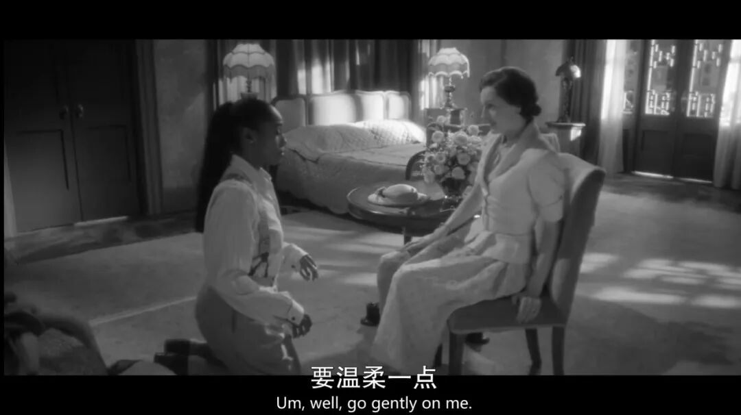 最开始,这个美停留在表面。我们都见过那个时期的女星的样貌,比如玛丽莲·梦露、英格丽·褒曼,她们很美。但现实中,她们都遇到过很讨厌的搭戏对象,这时候她们只能强颜欢笑。在这个层面上,艾玛完全演出了原版剧情中亲密关系的泡沫感,她充分展示了在和白人男演员的对手戏里,是女演员多萝茜全凭着自己的能力,硬演出来了浪漫。