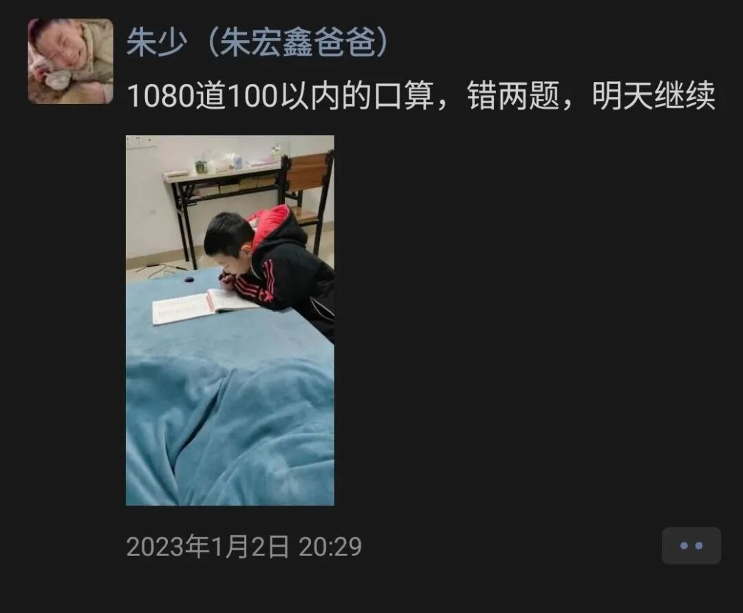 在这一时间段,虽然朱宏鑫的成绩越来越好,但已经不能让父亲足够满意。他在朋友圈里越来越多地吐槽儿子的「缺点」——「动不动就飘」「不配合拍照」「字写的(得)都没一年级好看」「比赛不认真」……