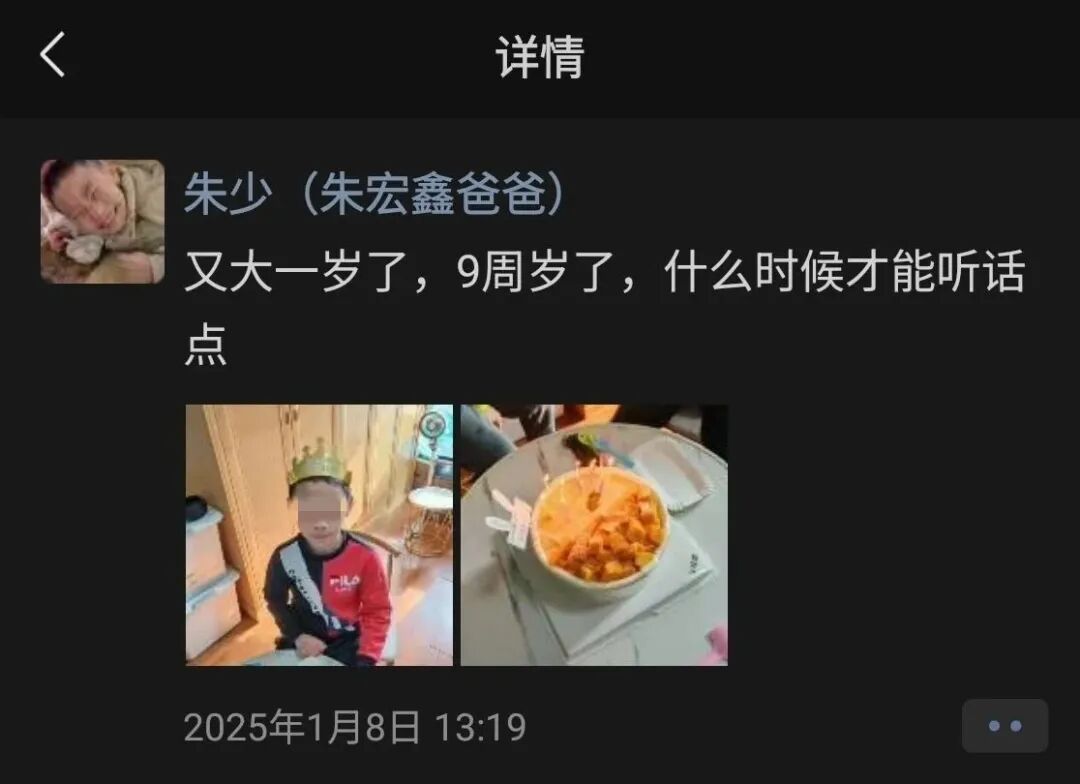 2025年1月,朱宏鑫在父亲的陪伴下度过了9岁生日,也是他生命里的最后一个生日。跟之前生日时的朋友圈内容不同,这一年朱松林抱怨「什么时候才能听话点」。