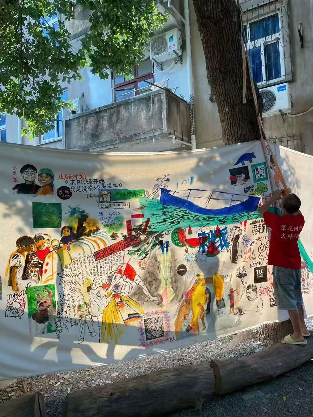 事实证明,办法总比困难多。他们想到一个广告位的主意,找来一张长5米、宽2米的白色画布,当成空白的广告位,500元一个位置。筹集资金是大家共同的任务。通过各自的人脉和朋友的帮助,他们得到了几十位赞助人的支持,其中不少是艺术家、书店和酒吧主理人。除此之外,也有他们认识的朋友们提供了捐助。他们把每个甲方的logo或是名字画到了画布上,最后整张画布画满了五颜六色的图案,挥舞起来像是一面旗帜。