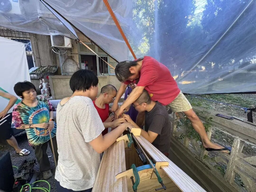 有几天,武汉的地面温度高达40度,把木条拼好后还要进行打磨,这时候必须带着工业防尘面具,以免粉尘吸到肺里。飞舞的木头碎屑溅起来,和汗水一起黏在身上,特别的痒。这是一段非常磨人的日子,跟龚豪此前「好玩」的预期很不一样,他发现,当你认真投入到一件事,它就「不再以好玩来定义」,光凭好玩,他们都没法坚持下去。