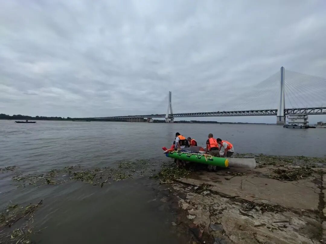 不论如何,三人都准备出发了。又花了两个小时,下午4点,在朋友们的帮助下,「穿山甲号」终于装上了所有行李,被推上了一个布满了水葫芦的微型码头。在这期间,长江露出了它危险的一面,大约3点,江水骤然浪起,直接拍打到了岸边四五米的地方,差点把船头的户外电源打湿。几个人争先恐后地跳着往岸边奔逃,也给围观的人群带来一丝紧张的气氛。