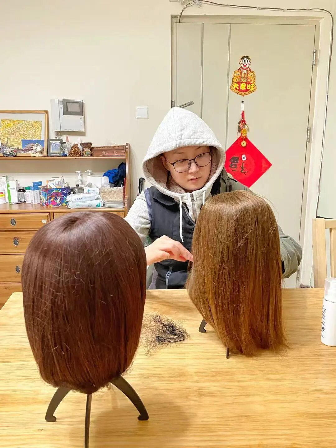 掉头发虽然不痛,但心里会很难受。我很快开始倒腾假发,在网上千挑万选,买了一款「辛芷蕾同款」。结果实物到了以后,丑得不行,我不甘心,查了查攻略,看别人说假发是需要打理的,第二天一早,我连早饭都顾不上吃,把假发放在桌上认真地梳理、修剪。也挺好笑的,整理完之后,是好看了一点儿,但效果跟辛芷蕾没什么关系,更像是《洪湖赤卫队》里的双枪女队长。