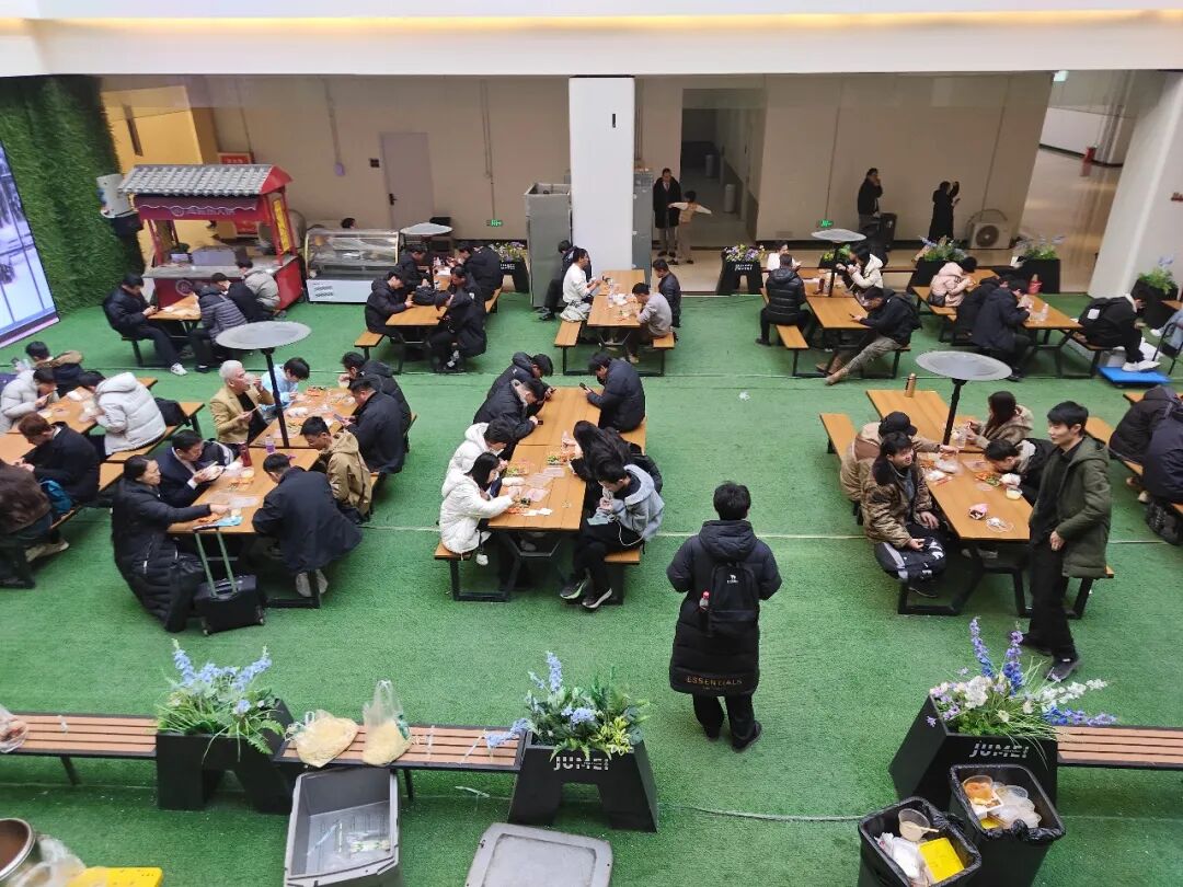 短剧演员们在吃午餐,许多人都穿着西装。易方兴 摄