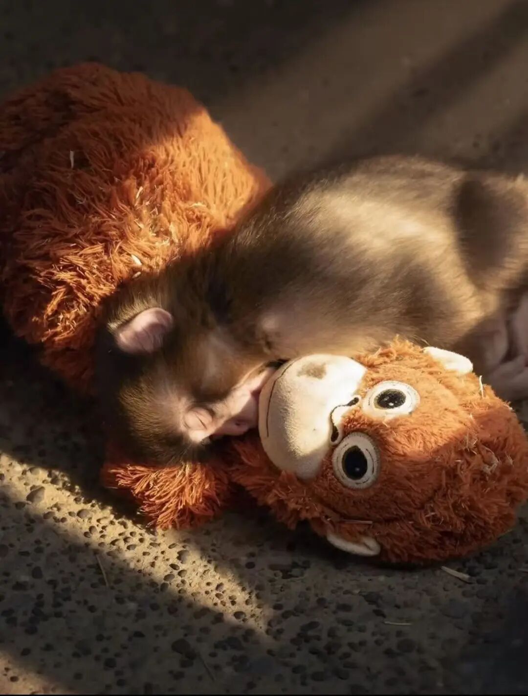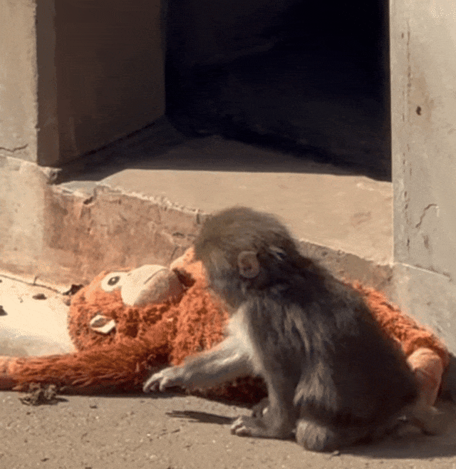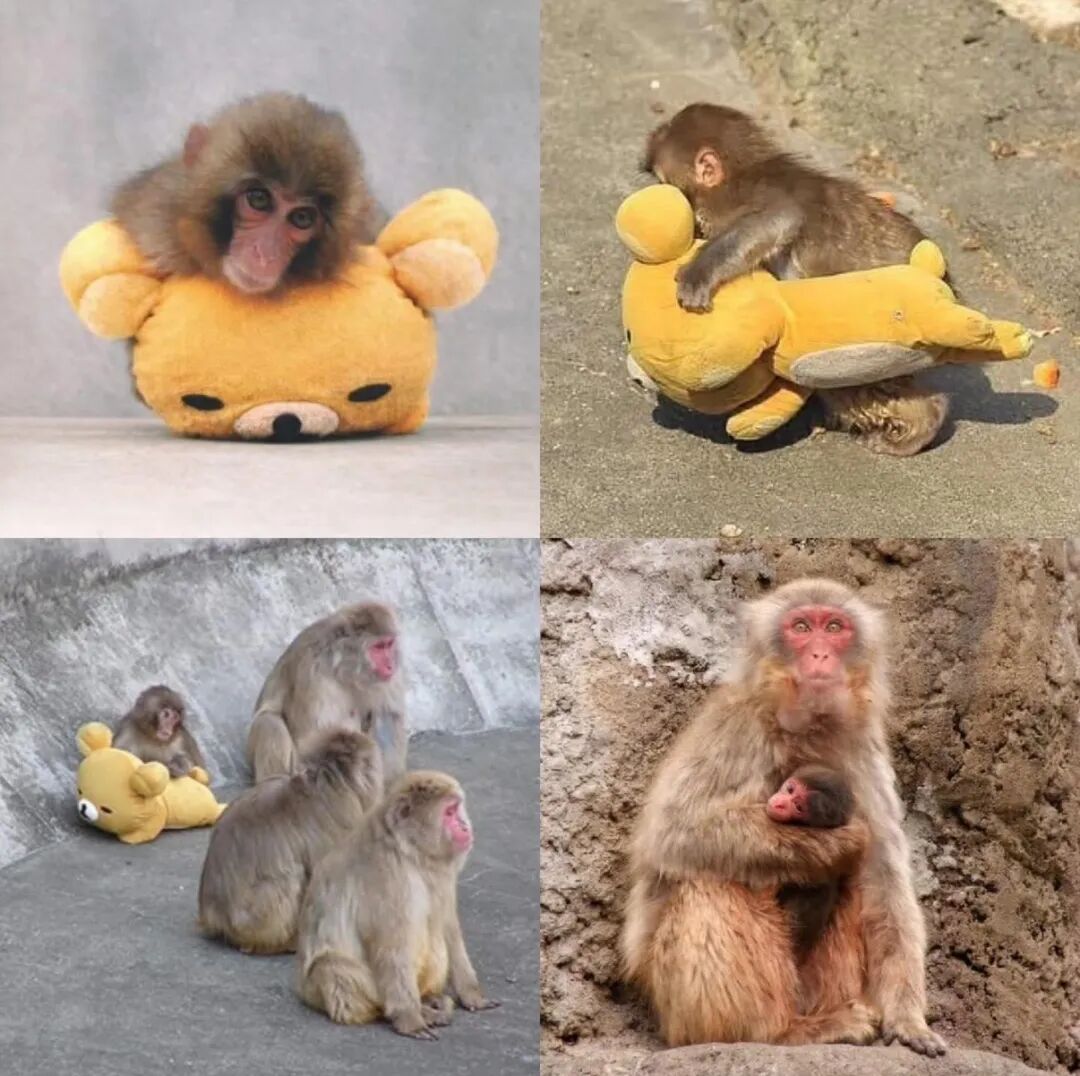 但刚出生的幼猴本能地需要紧抓母猴毛发,以获得安全感并锻炼肌力,如果没有可以抓握的东西,幼猴会陷入极度的焦虑和恐惧中。最初,饲养员给它塞了卷成筒状的毛巾,Punch感到不适,换成其他玩偶,它力气太小根本抓不住。直到出生第三天,饲养员拿来一只宜家红毛猩猩玩偶。红猩猩的毛够长,容易抓握,还附有布制粘扣带,Punch一把抓住了它,再也没有松开。