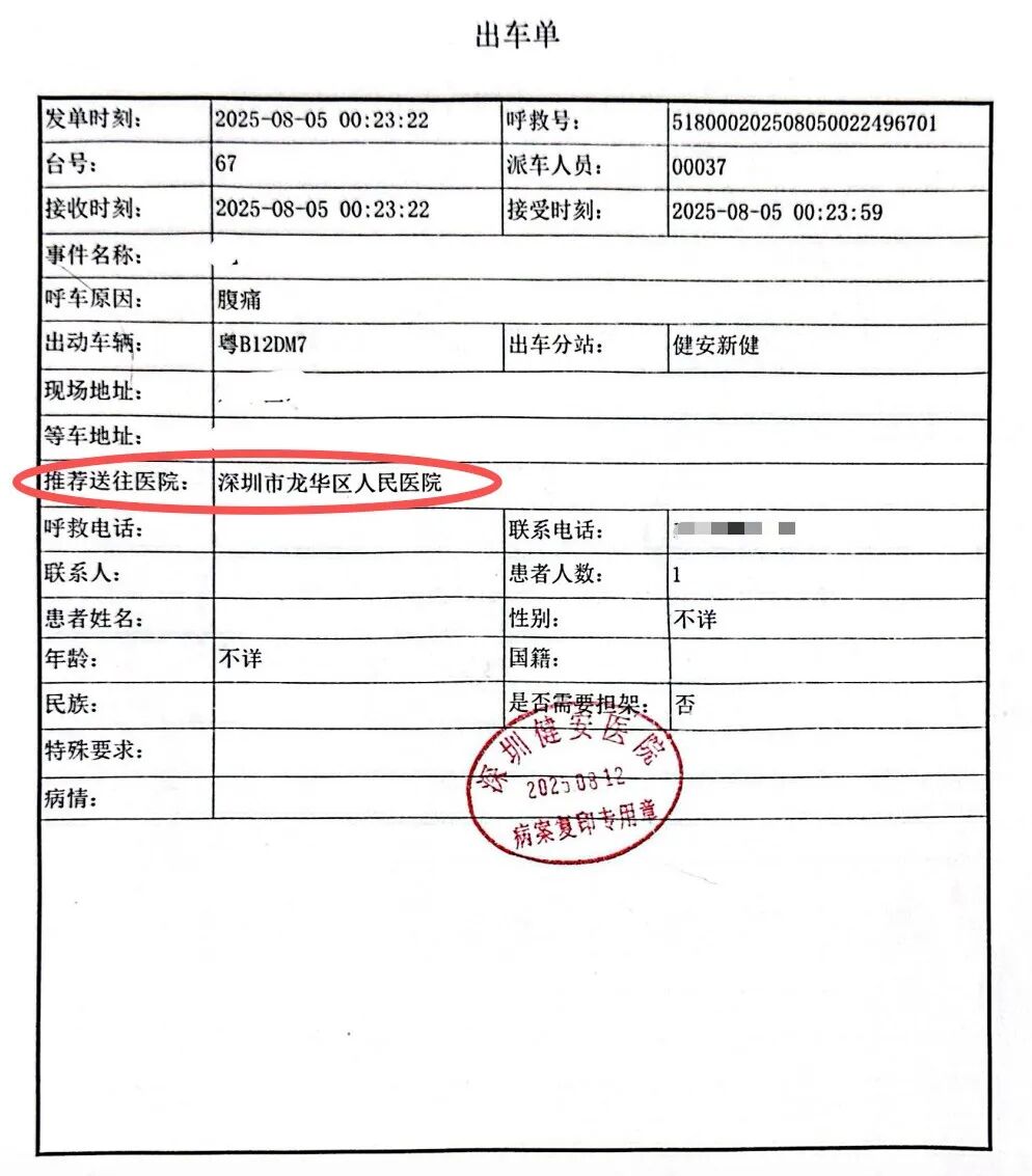 救护车出车单显示,推荐送往龙华区人民医院