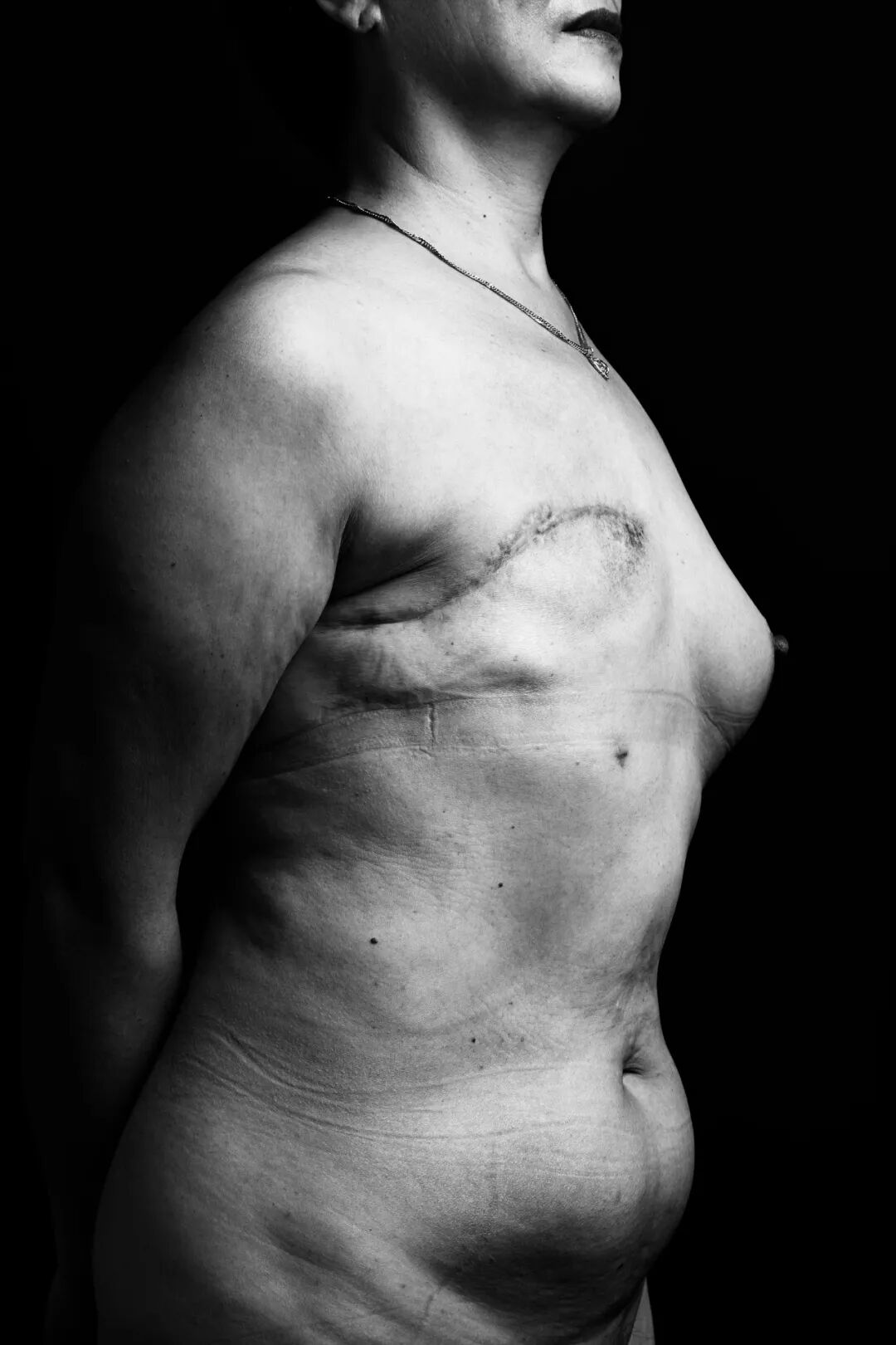 一个雨天,李艾筱轻轻触碰了一位59岁患有乳腺癌的母亲左胸一条长长的伤疤,「伤疤硬硬的,周围软软的。」得知患上乳腺癌之后,这位阿姨很爽快地决定切除左边的乳房。李艾筱问她,伤疤还疼吗?「偶尔还疼。」阿姨笑着回答。