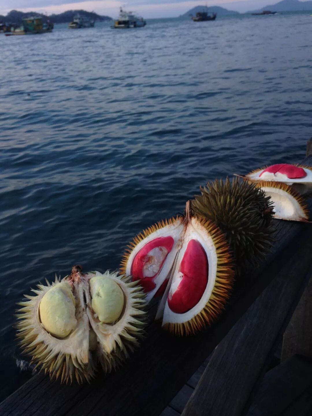 没有人见过实物,多年来只有几张图片在江湖上流传——一只榴莲裂开,果肉是渐变的彩虹色,像一滴红墨水晕开在黄玉里,瑰丽、奇异、浪漫。